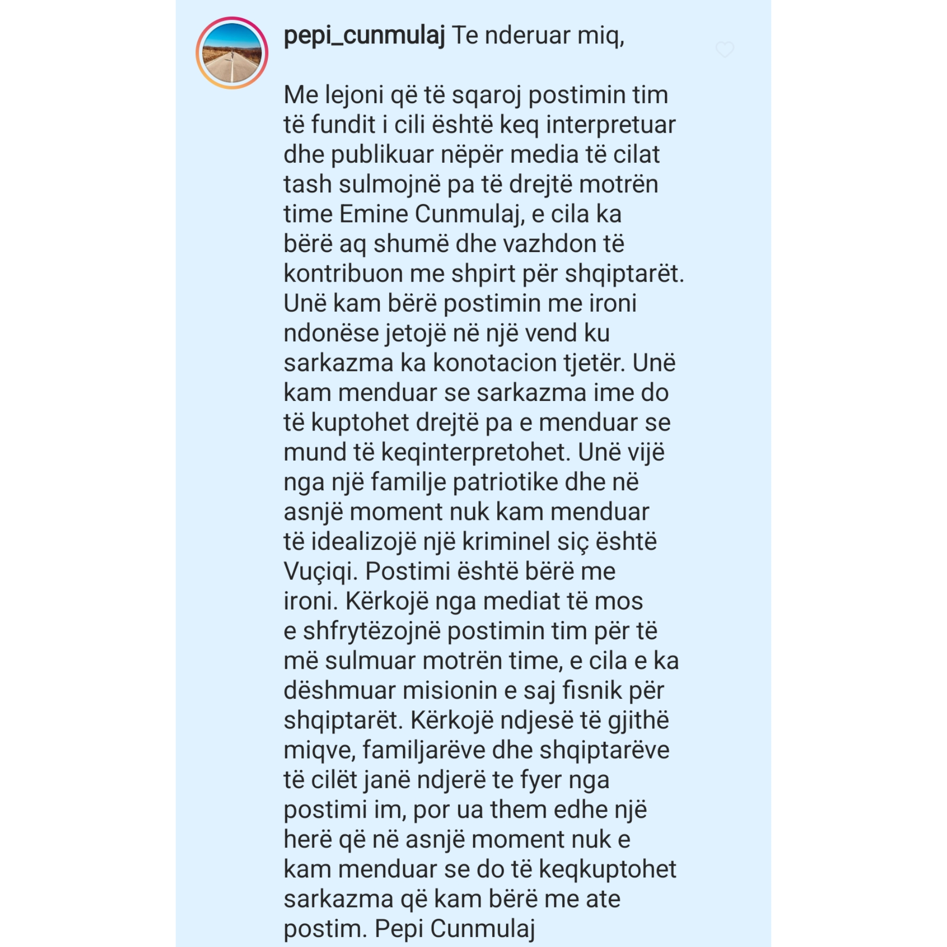 Unë kam bërë postimin me ironi ndonëse jetojë në një vend ku sarkazma ka konotacion tjetër. Unë kam menduar se sarkazma ime do të kuptohet drejtë pa e menduar se mund të keqinterpretohet. Unë vijë nga një familje patriotike dhe në asnjë moment nuk kam menduar të idealizojë një kriminel siç është Vuçiqi. Postimi është bërë me ironi. Kërkojë nga mediat të mos e shfrytëzojnë postimin tim për të më sulmuar motrën time, e cila e ka dëshmuar misionin e saj fisnik për shqiptarët. Kërkojë ndjesë të gjithë miqve, familjarëve dhe shqiptarëve të cilët janë ndjerë te fyer nga postimi im, por ua them edhe një herë që në asnjë moment nuk e kam menduar se do të keqkuptohet sarkazma që kam bërë me ate postim.