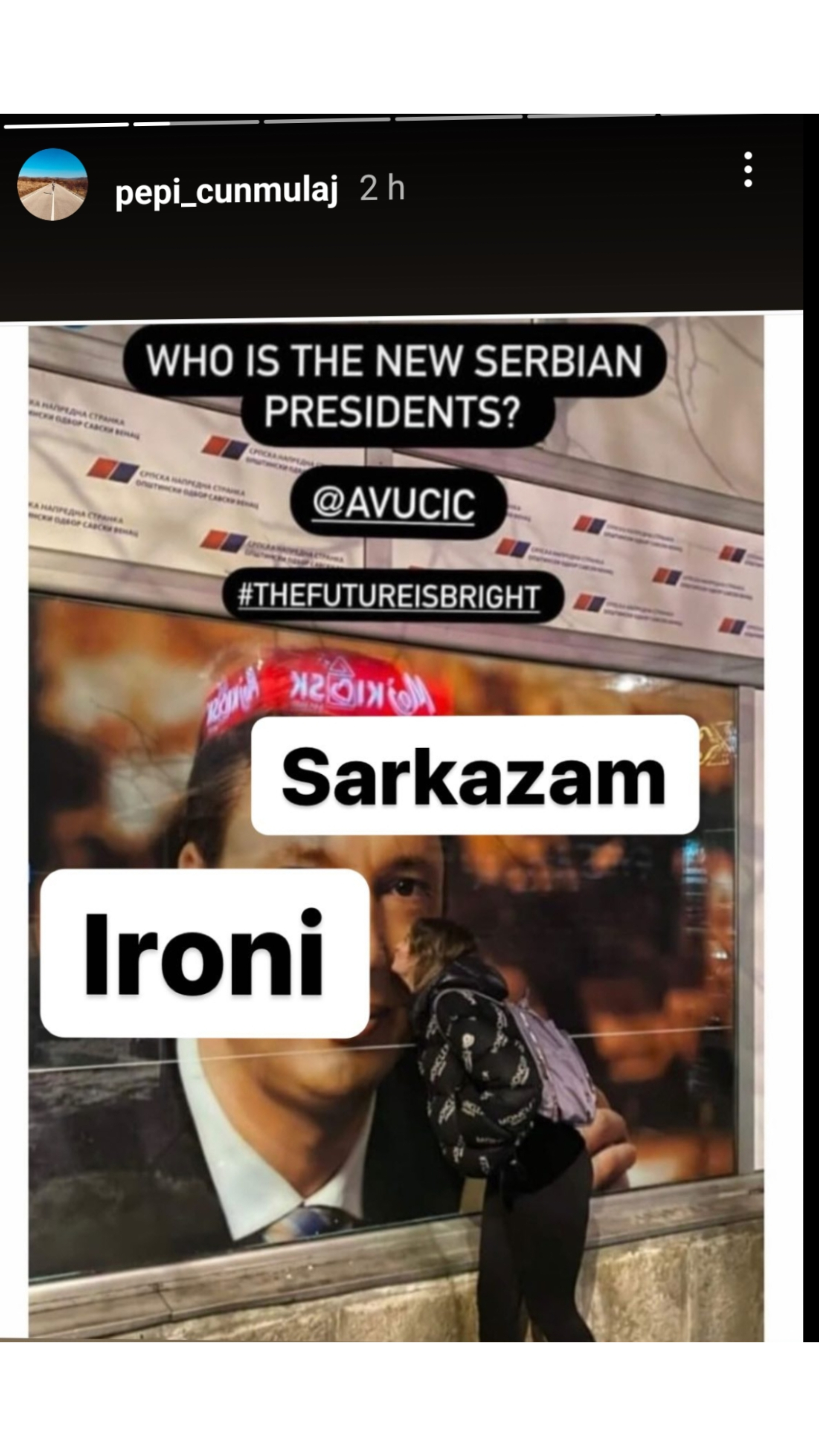 Pepi Çunmulaj, motra e modeles Emina Çunmulaj ka reaguar pasi mediat kanë publikuar fotografinë e saj ku shfaqej duke e puthur posterin e Presidentit serb Aleksander Vuçiq me mbishkrimin "e ardhmja është e ndritur.
