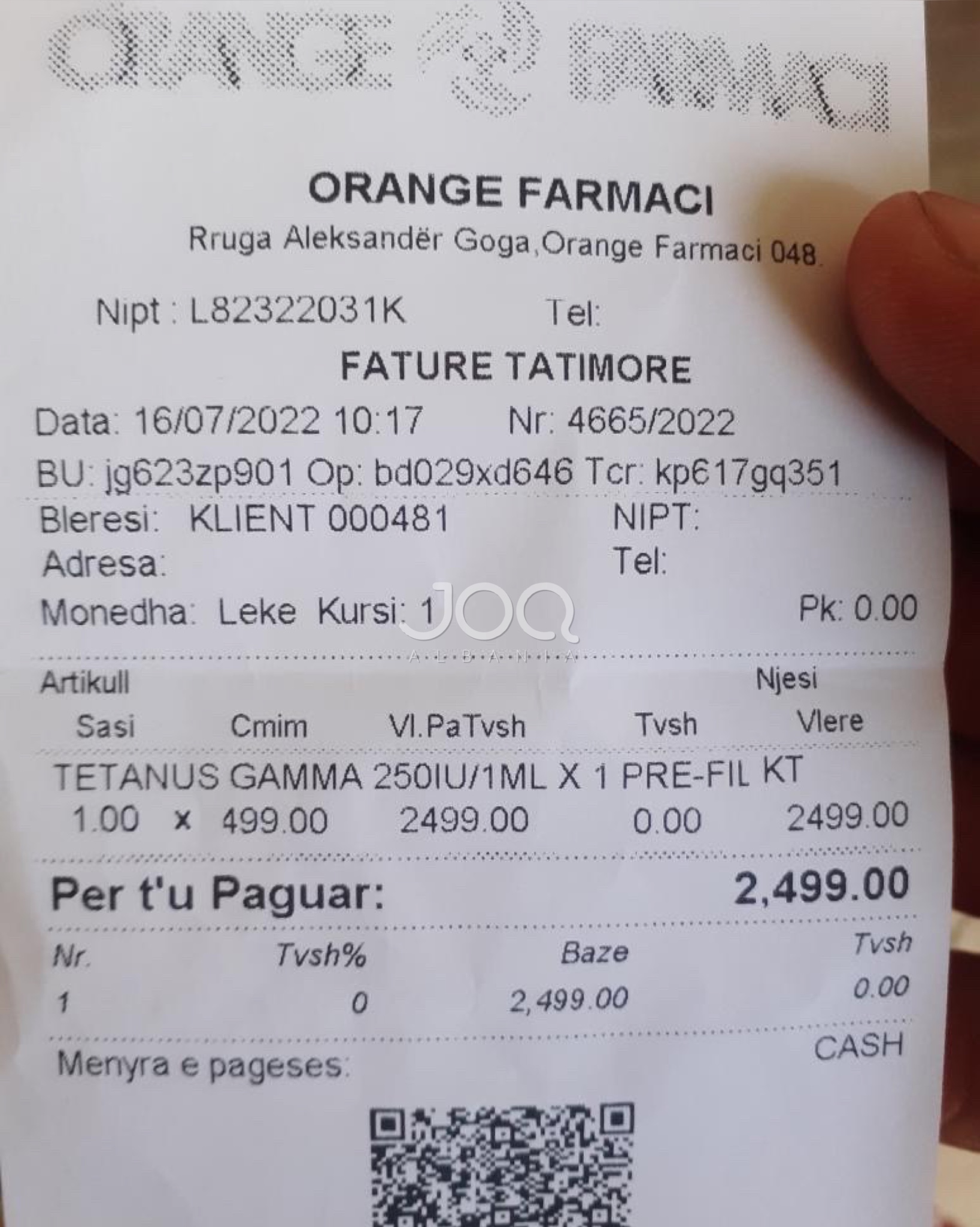 Pak vite më parë nga 150 Lekë çmimi i shkoi në 1700 Lekë të reja, e sot shitet me 2500 Lekë në farmacitë e vendit. Një qytetar ka denoncuar për JOQ Albania çmimin e lartë të vaksinës pasi u detyrua ta blinte pasi u ça në një gozhdë.