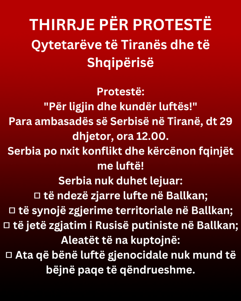 Sipas njoftimit, në datë 29 dhjetor ora 12:00, para Ambasadës së Serbisë në Tiranë, ftohen qytetarët e Tiranës dhe Shqipërisë që të marrin pjesë në protestën për ligjin dhe kundër luftës.