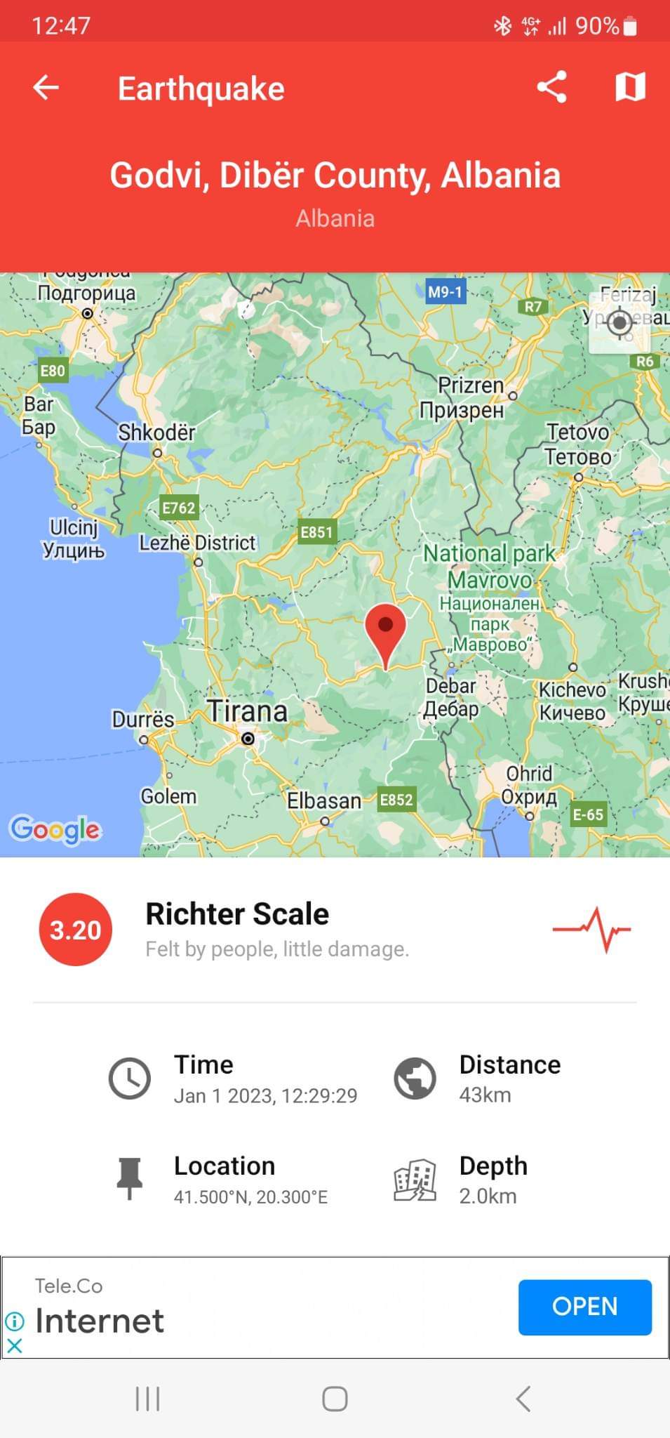 Një tërmet me magnitudë prej 3.2 shkallë të Rihterit ka goditur ditën e parë të vitit 2023, Shqipërinë.