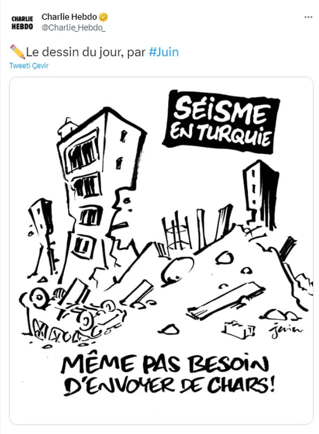 Në rrjetet sociale, revista e famshme ka botuar një karikaturë, e cila ka ngjallur me të drejtë një lumë të madh reagimesh. Në karikaturën e publikuar në revistë, në një pamje ndërtesash të rrënuara shkruheshin fjalët: Tërmet në Turqi! Nuk ka nevojë as të dërgohen tanke...