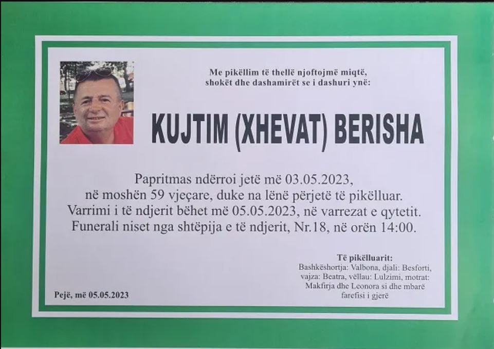 Ndërsa familja e të ndjerit ka hapur dyert e mortit dhe ka njoftuar se ceremonia mortore për të do zhvillohet sot (e Enjtë) në ora 14:00 në Pejë.