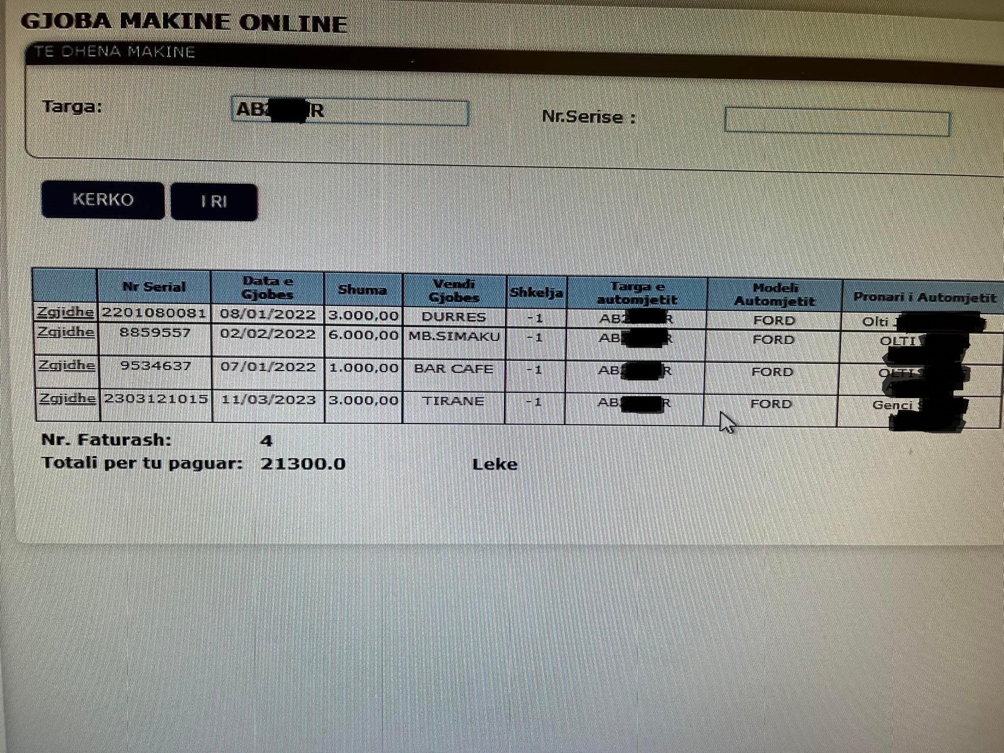Ai shprehet se kanë dalë nga hiçi disa gjoba të para më shumë se një viti, të cilat janë marrë nga pronari i mëparshëm i makinës, i cili në fakt me shumë mundësi i ka paguar. Dyshohet kështu, sepse makina para se të ndërrojë pronar, kalon në sistemin digjital të “RBS” (regjistri i barrës siguruese).