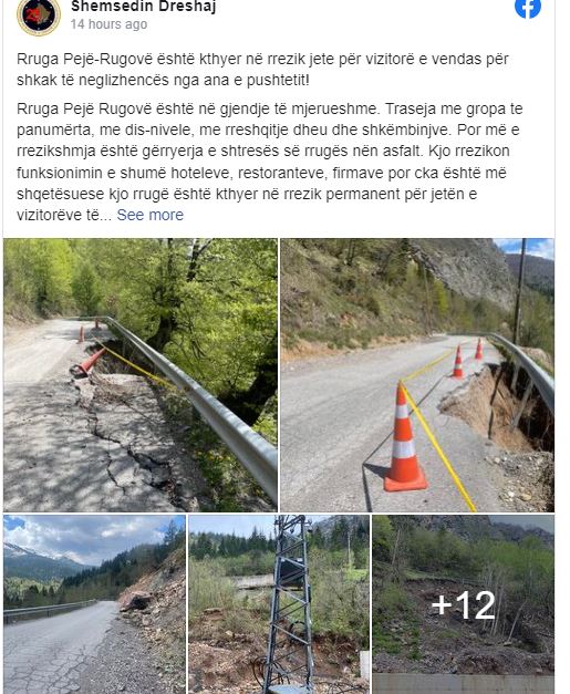 “Rruga Pejë-Rugovë është kthyer në rrezik jete për vizitorë e vendas për shkak të neglizhencës nga ana e pushtetit! Rruga Pejë Rugovë është në gjendje të mjerueshme. Traseja me gropa te panumërta, me dis-nivele, me rreshqitje dheu dhe shkëmbinjve. Por më e rrezikshmja është gërryerja e shtresës së rrugës nën asfalt. Kjo rrezikon funksionimin e shumë hoteleve, restoranteve, firmave por cka është më shqetësuese kjo rrugë është kthyer në rrezik permanent për jetën e vizitorëve të shumtë që e frekuentojnë këtë rrugë.”, shkruan ai.