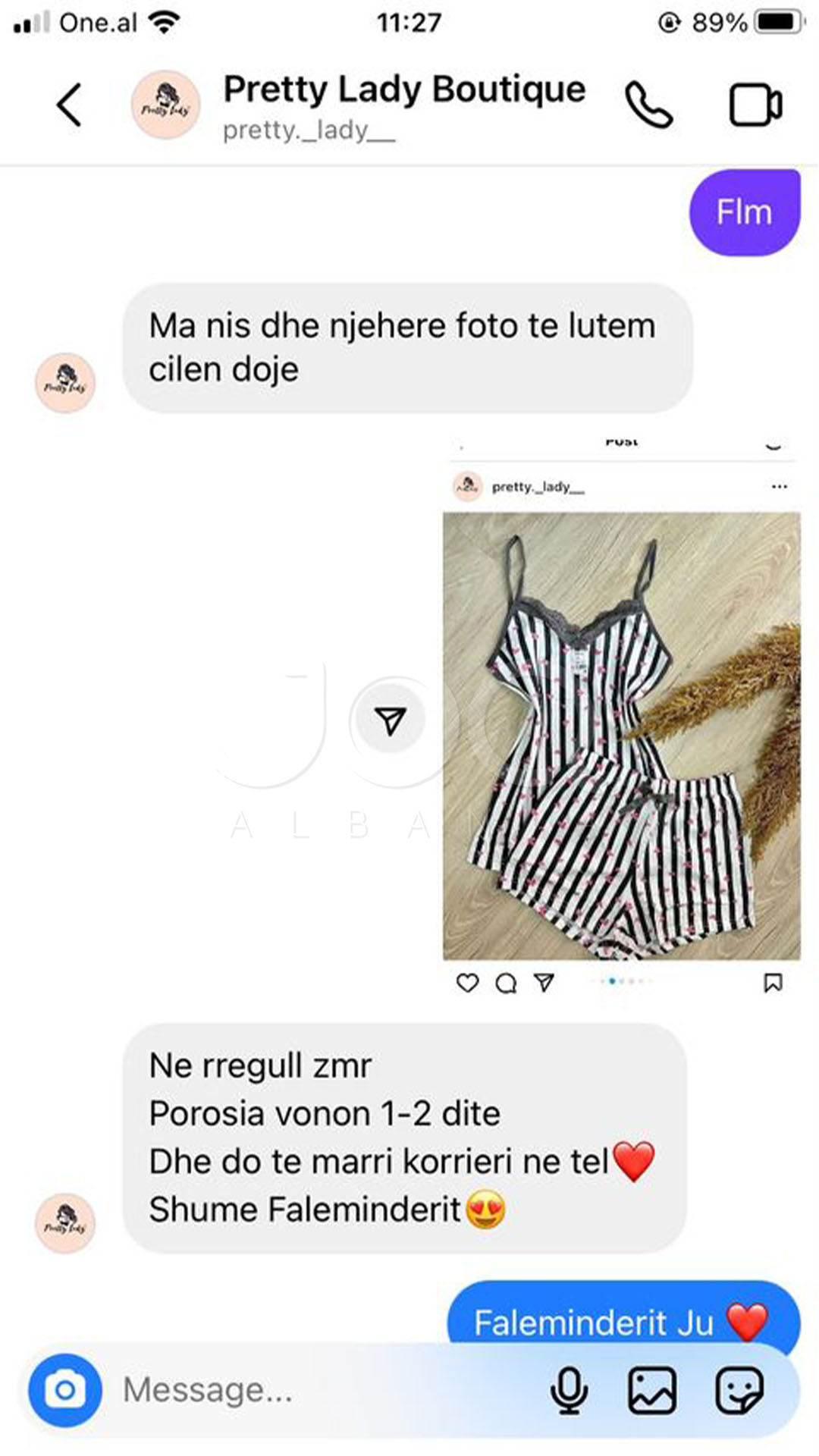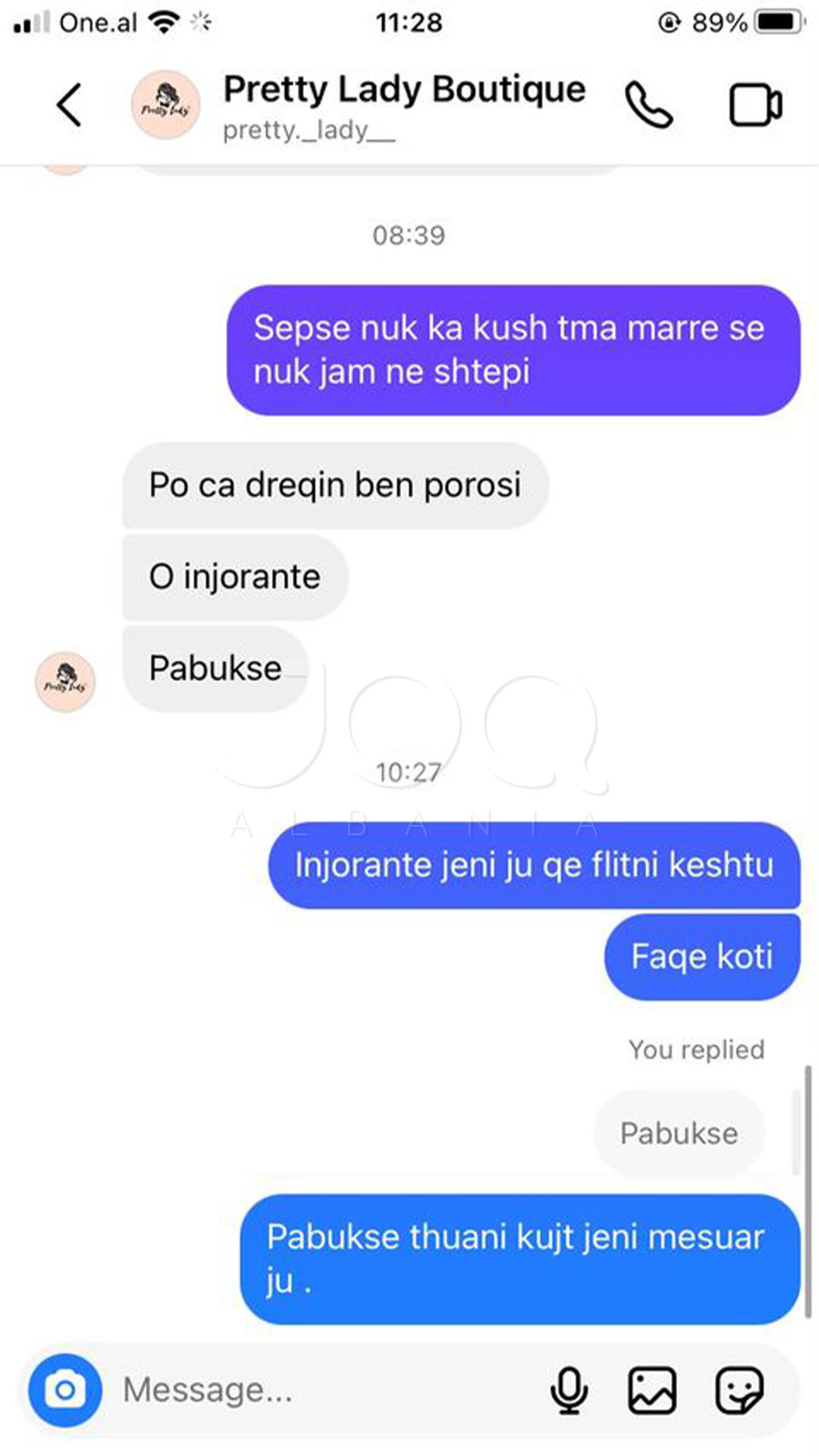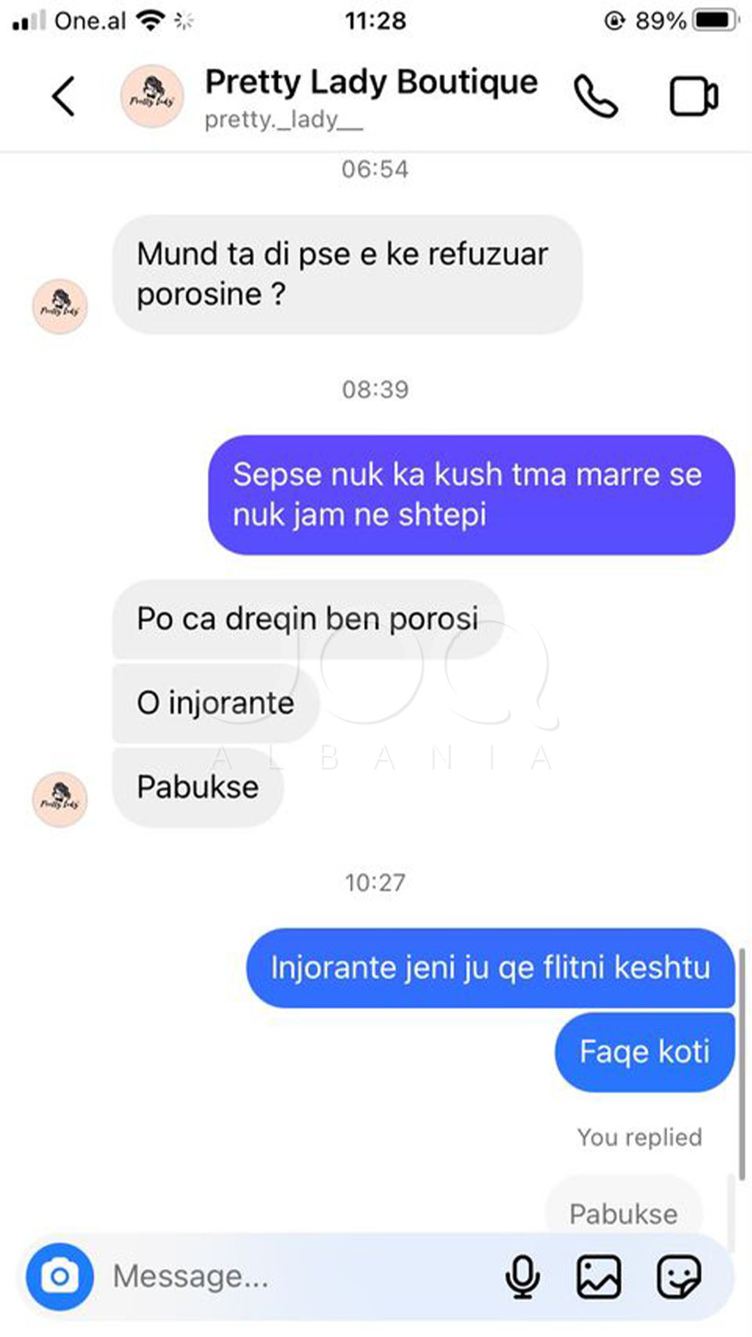 Sipas qytetares, në momentin që i ka thënë faqes se nuk mund ta marrë porosinë në kohë, stafi i shitjeve online, i është përgjigjur duke e cilësuar qytetaren si pabukse dhe injorante. Vajza ka nisur edhe mesazhet që ka bërë me personin që administron faqen ku ajo kishte porositur rroba online.