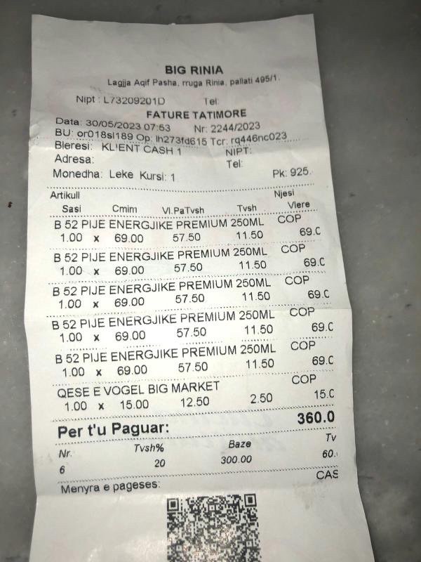 Sikur duket në faturë një kënaçe kushton 69 lekë. Pra jo vetëm që nuk ka ofertë, por edhe çmimi bazë i afishuar në raft nuk është reali. Kështu në fund qytetari është detyruar të paguaj 360 lekë.
