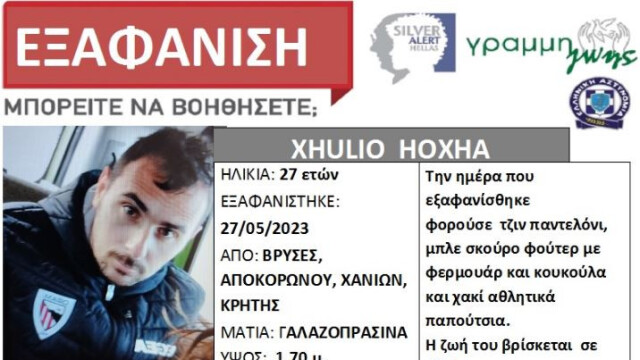 Mediat fqinje raportojnë se 27-vjeçari Xhulio Hoxha është zhdukur nga shtëpia e tij në Kretë mëngjesin e së shtunës së kaluar.