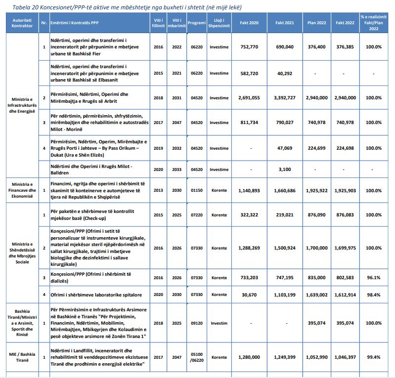 Fondet buxhetore të planifikuara për vitin 2022, sipas planit vjetor të ndryshuar, me destinacion mbështetjen nga buxheti për kontratat konçesionare/PPP, rezultojnë rreth 12.71 miliardë lekë. Pagesat faktike për vitin 2022, në total rezultuan në rreth 12.64 miliardë lekë ose 99.5% e planit vjetor 2022, të ndryshuar”