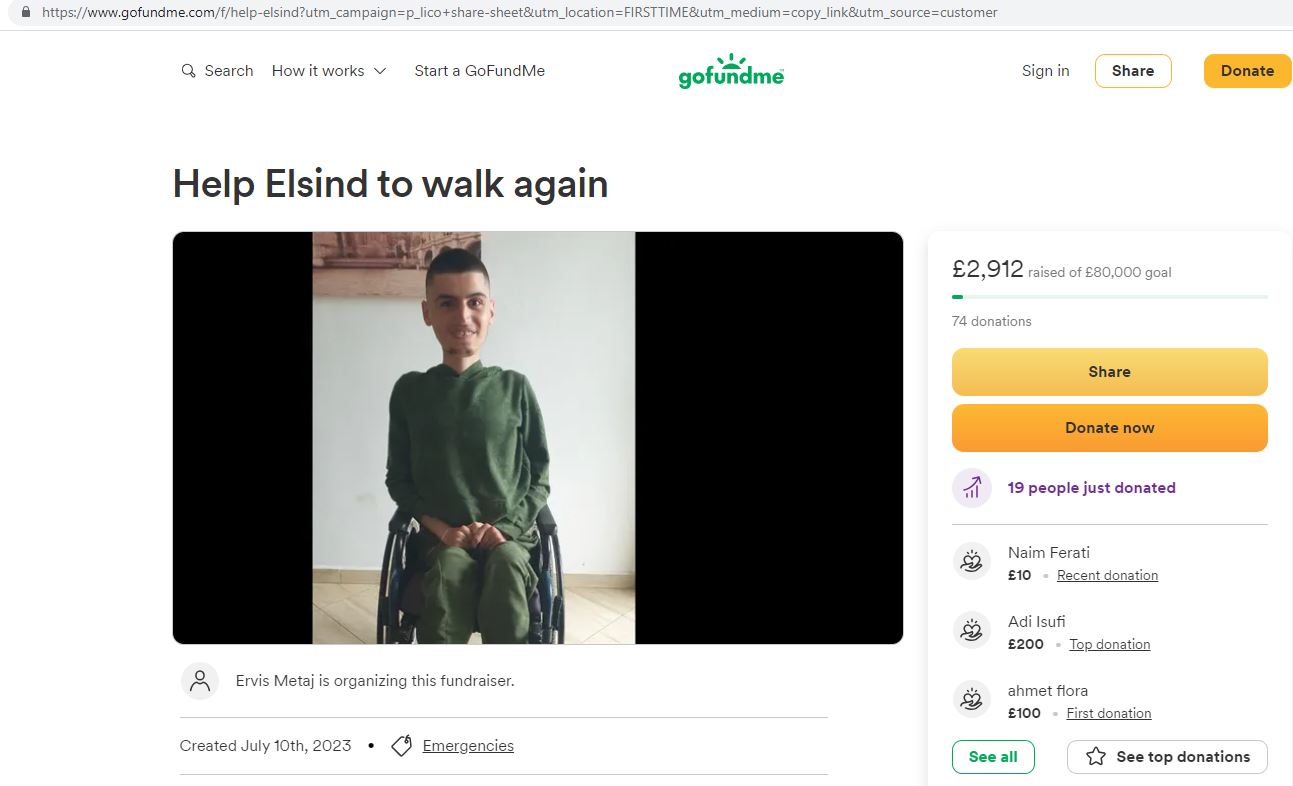 “Ju lutem me ndihmoni kam nevojë për ndihmën tuaj. Elsindi Meta quhet djali 19 vjeç i cili, kjo sëmundje u shfaq ne moshën 4 vjeçare dhe me rritjen e moshes u paralizua dhe kjo sëmundje po ia vështirëson jetën cdo dite e me shume.Elsindi ka nevoje urgjente per te udhetuar drejt Turqisë ne spitalin ku do të marrë trajtimin e duhur për të parandaluar sëmundjen që ka prekur tashmë qelizat bërthamore, kjo sëmundje po pushton çdo ditë e më shumë trupin e Elsindit.