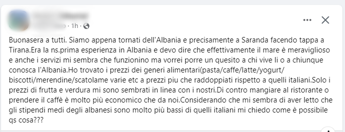 Mirëmbrëma të gjithëve. Sapo jemi kthyer nga Shqiperia dhe pikerisht ne Sarande duke bere nje ndalese ne Tirane. Ishte eksperienca jone e pare ne Shqiperi dhe me duhet te them qe deti eshte vertet i mrekullueshem dhe sherbimet duket se funksionojne por do doja te beja nje pyetje per ata qe banojne aty apo ndonje qe njeh Shqiperine... Kam pare cmimet e produkteve ushqimore (makarona/kafe/qumesht/kos/biskota/snacks etj me cmime mbi dyfish ne krahasim me cmimet ne Itali. Vetem cmimet e frutave dhe perimeve me dukej ne perputhje me tonat. Nga ana tjeter ngrenia ne restorant pirja e nje kafe eshte shume me e lire se tek ne. Duke pasur parasysh qe kam lexuar se rrogat mesatare te shqiptareve jane shume me te ulta se ato italiane, pyes veten se si është e mundur kjo???