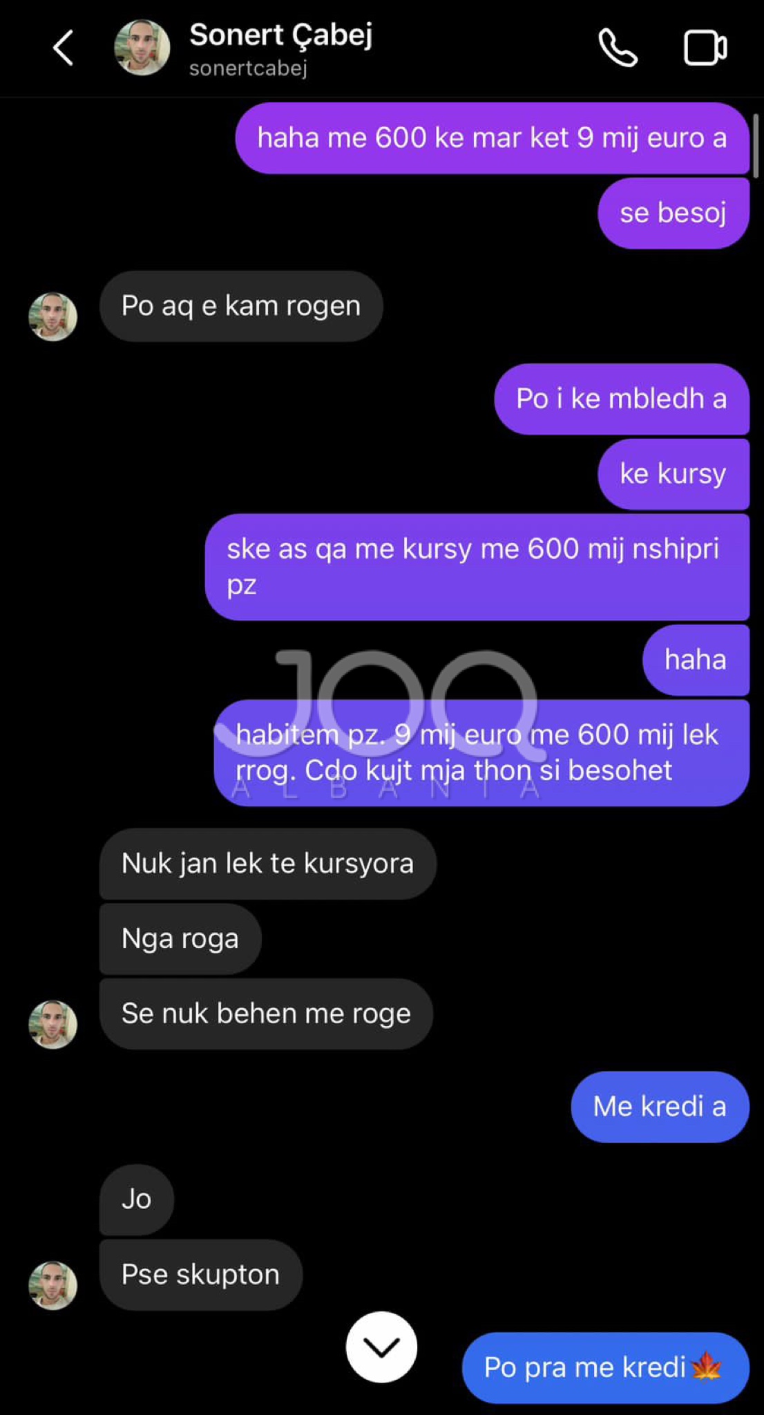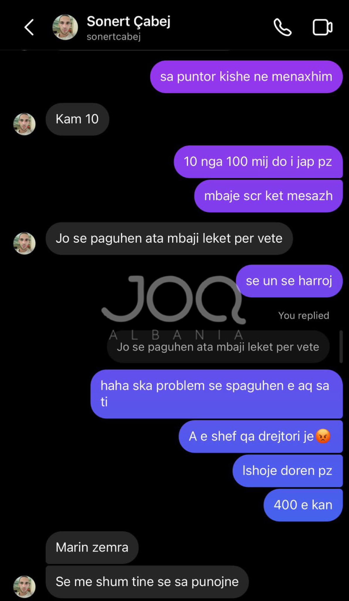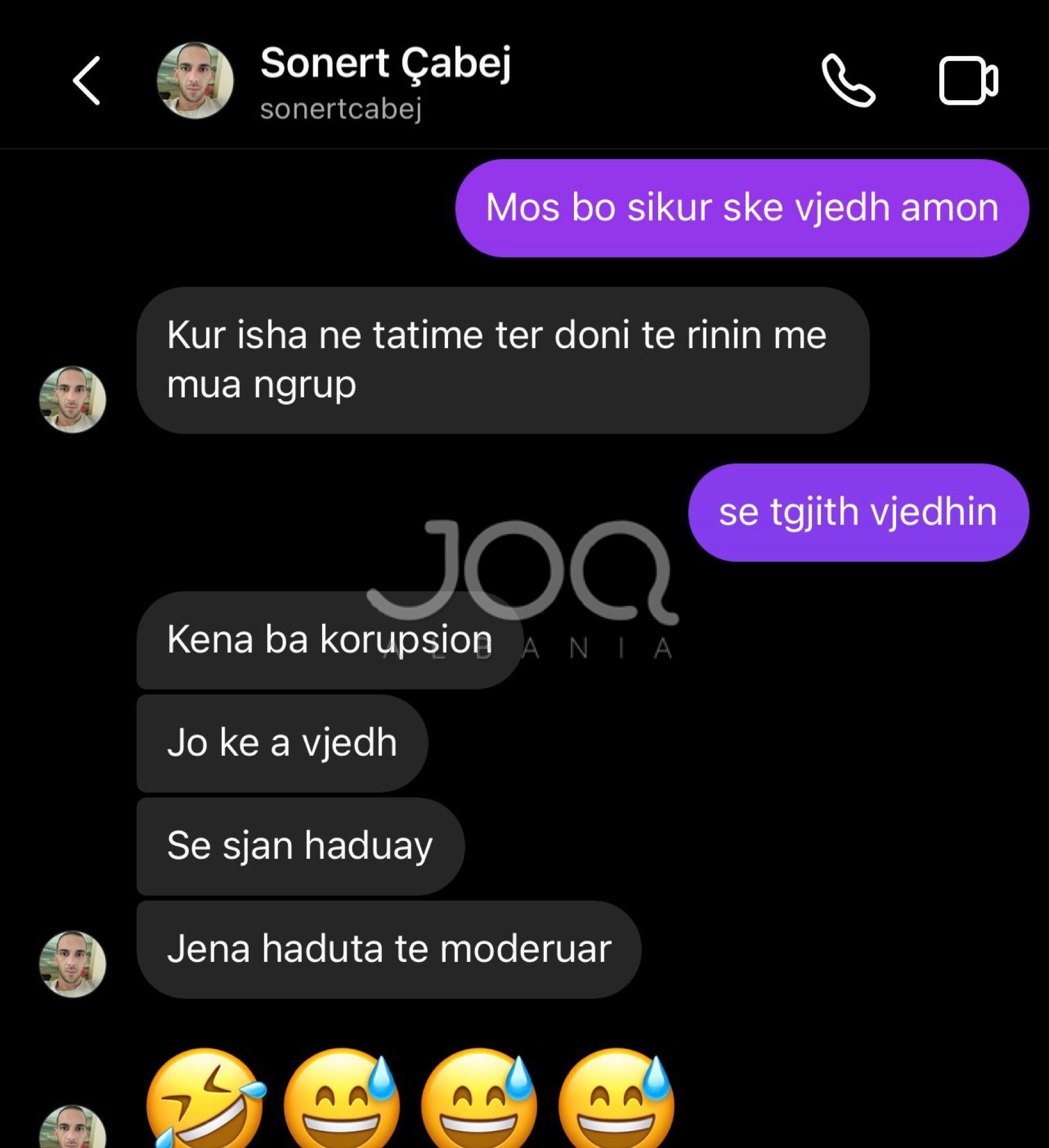 Një vajzë ka dërguar një denoncim në redaksinë e JOQ Albania për një person të quajtur Sonert Çabej, i cili pretendon se është punonjës i Bashkisë Tiranë. Çabej i shkruan vajzës në mesazhe se është punonjës i Bashkisë, mik i Erion Veliajt dhe kryebashkiakut të Kolonjës, Erion Isai.