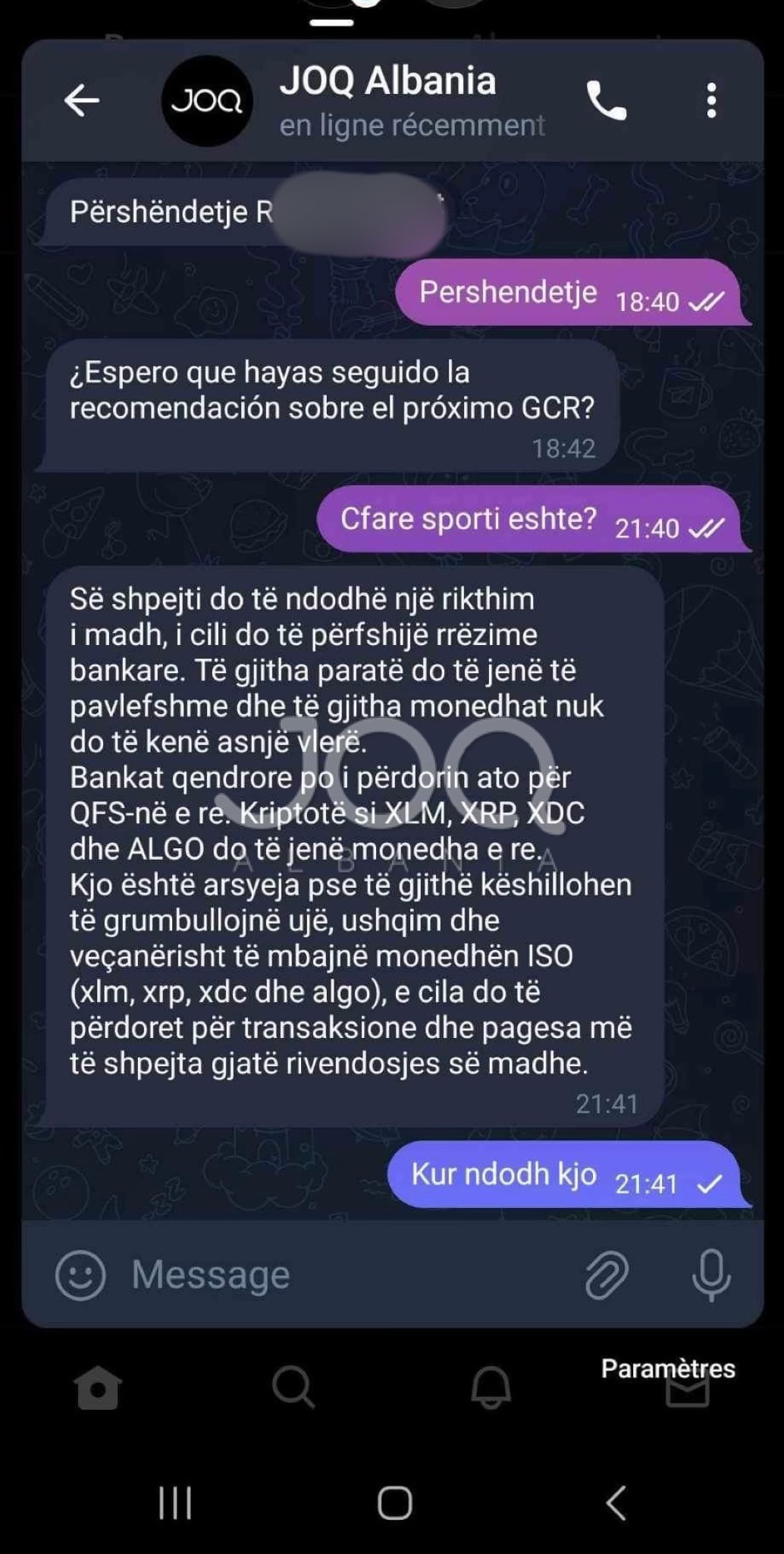 Një qytetar i është drejtuar redaksisë tonë për të treguar se si një llogari me emrin “JOQ Allbania” i ka shkruar në shqip dhe spanjisht duke i folur për rrëzime bankare dhe pavlefshmërinë e parave dhe monedhave.