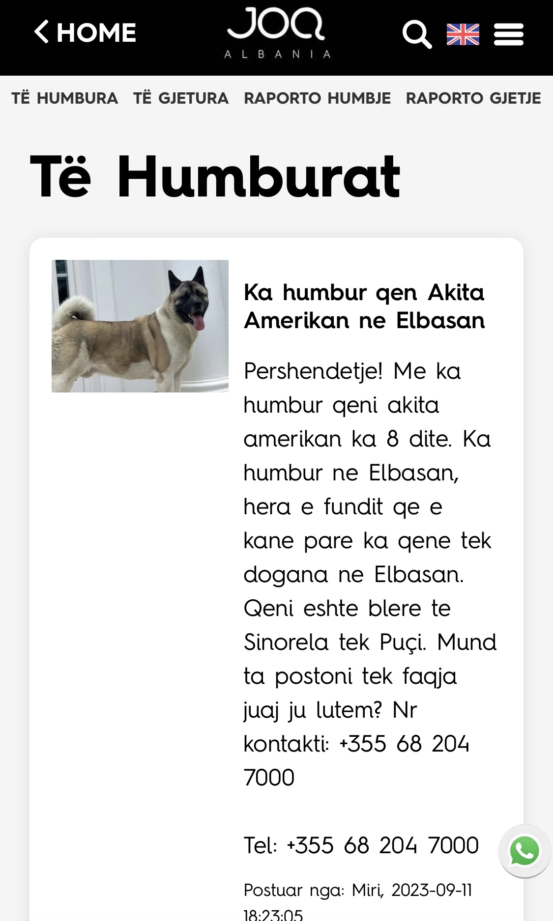 Pershendetje! Me ka humbur qeni akita amerikan ka 8 dite. Ka humbur ne Elbasan, hera e fundit qe e kane pare ka qene tek dogana ne Elbasan. Qeni eshte blere te Sinorela tek Puçi. Mund ta postoni tek faqja juaj ju lutem? Nr kontakti: +355 68 204 7000
