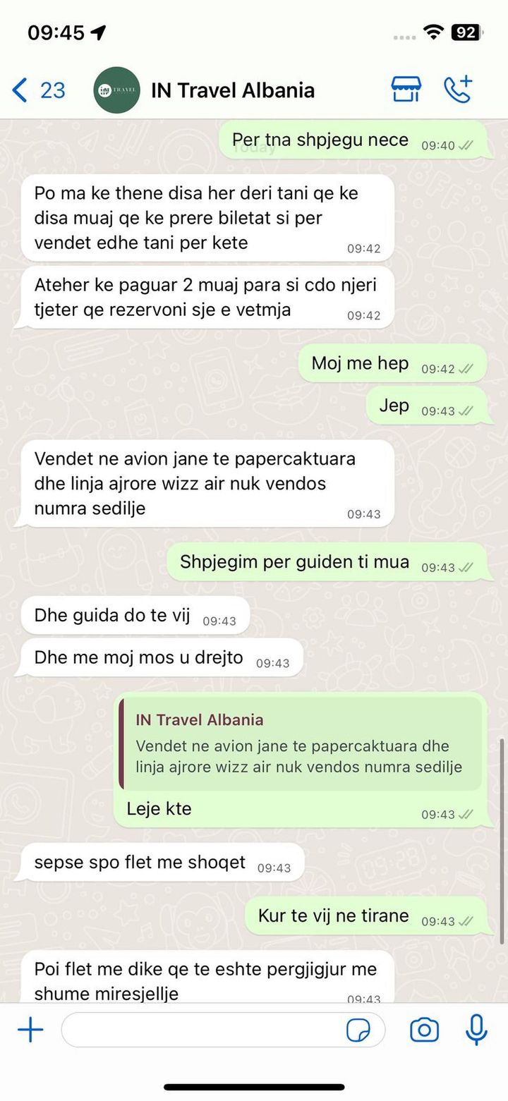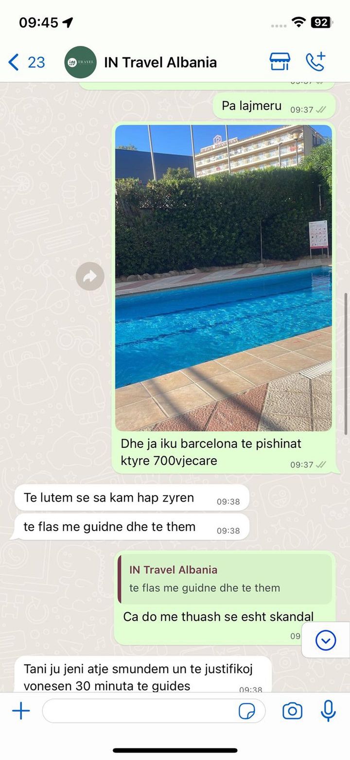 Një qytetare i është drejtuar redaksisë së JOQ me një mesazh denoncues. Ajo thotë se ka rezervuar një guidë për në Barcelonë për një pagesë prej 380 euro personi. Qytetarja shton se denoncimi është për agjencitë shqiptare. Ajo shkruan se ka qenë grup dhe janë orientuar nga një person i agjencisë së udhëtimeve ATHS – Plazh.com.