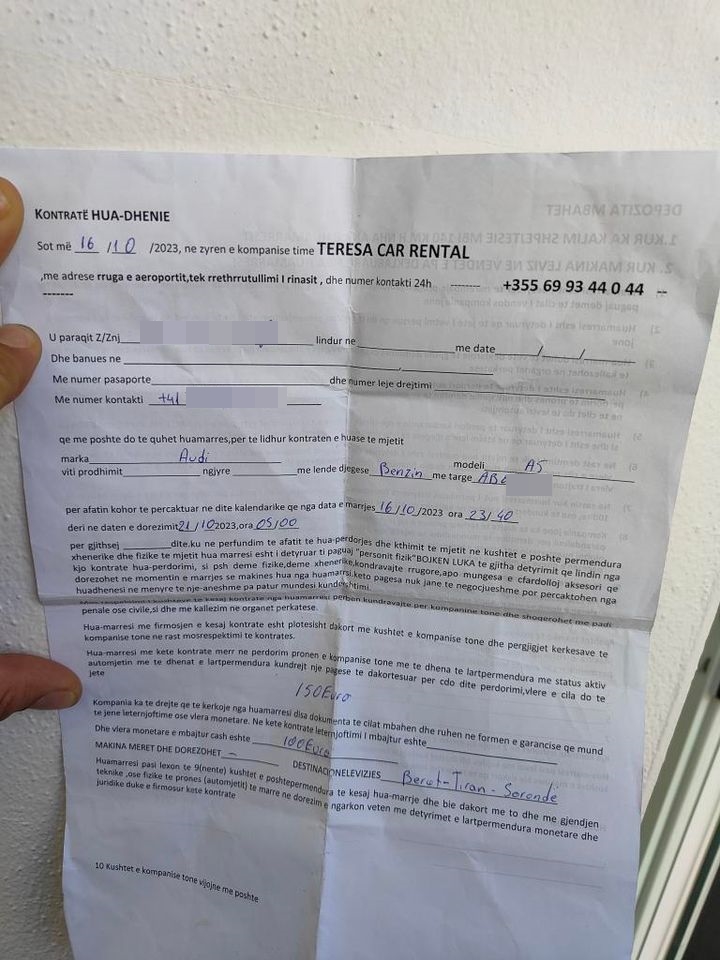 Denoncuesi shkruan se në datë 16 tetor 2023, ka udhëtuar nga Zvicra në Tiranë dhe kur ka mbërritur këtu ka porositur një makinë me qira, por që i ka shkatërruar pushimet atij dhe të dashurës së huaj. Ai thotë se makina e marrë me qira te "Teresa Car Rental" ka qenë pa dokumente, pa sigurime dhe e dëmtuar.