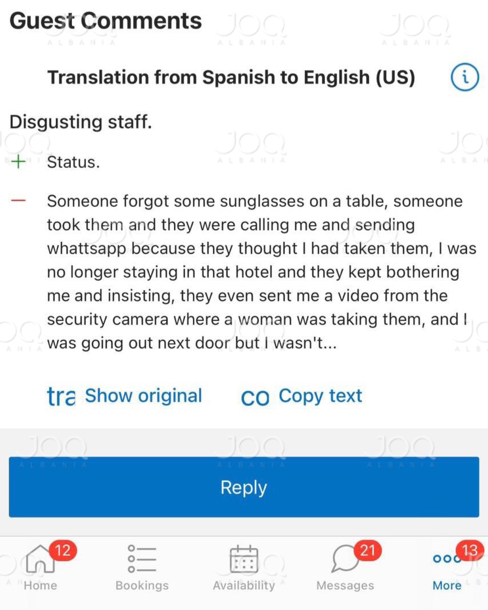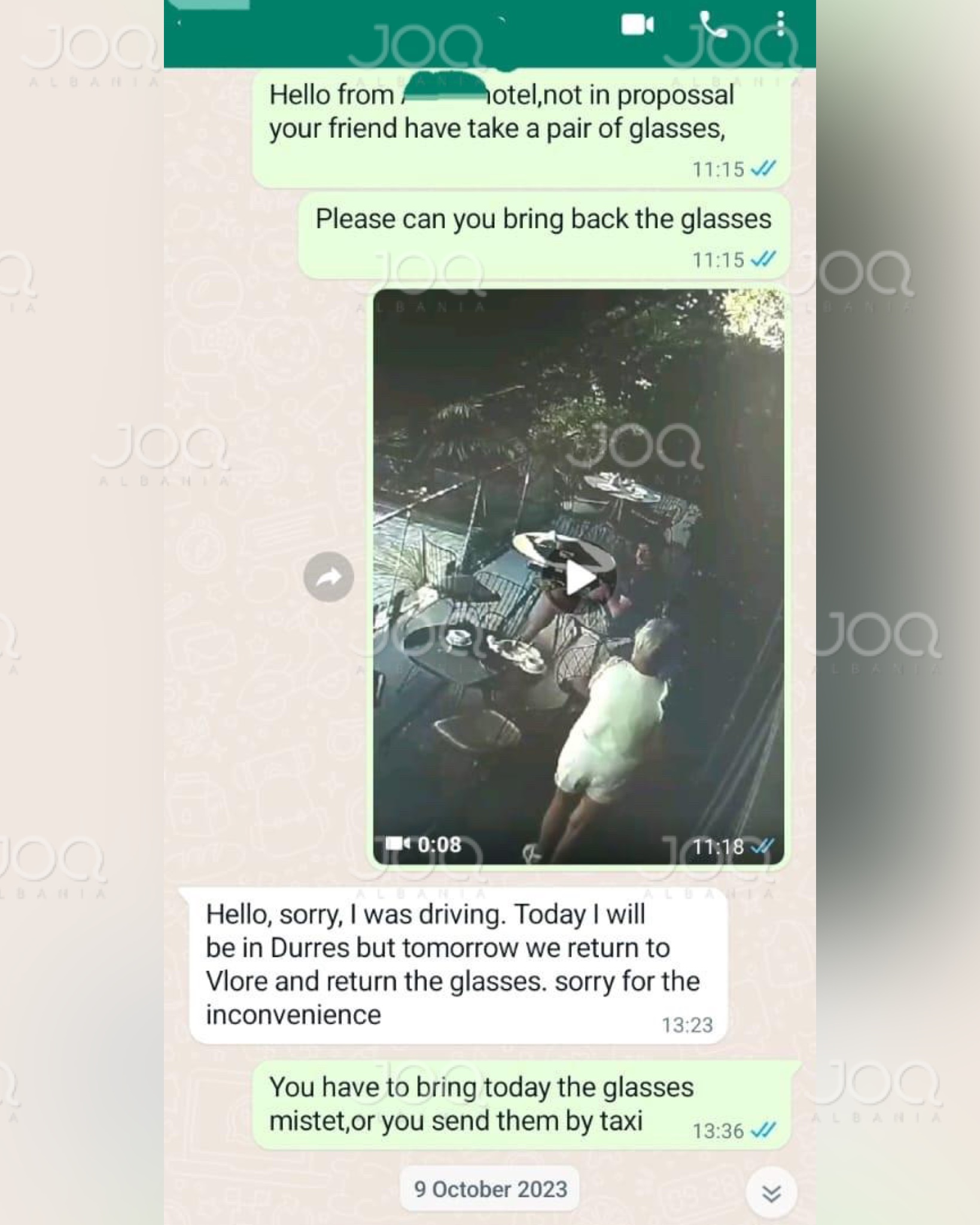 Pasi konstatuam nga kamerat e siguris që i kishishin marë këta ju dërguam sms në nr e tel që të kthenin syzet por na than se do vinin në të nesërmen pasi i kishin mar gabimisht dhe do qëndronin në durrës për 1 natë dhe do vinin sërisht në vlorë gjë që nuk e besova! Nuk mjaftoj kjo por na shkruajti dhe në booking që e kishim akuzuar padrejtësisht për vjedhje .