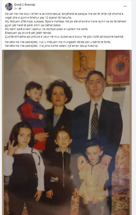 “Kaluan tre vite sikur në ferr e se kisha besuar asnjëherë se parajsa ime do të ishte një dhomë e vogël dhe e zymt e fshehur pas 12 dyersh të hekurta. Aty festuam ditëlindje, suksese, fejsa e martesa. Në po atë dhomë e more lajmin se do të bëhesh gjysh për herë të parë. Altini po bëhet baba! Aty kemi qarë e kemi qeshur, na recitoje poezi e luajtem me karta. Biseduam aq shumë për jetën tënde! Çuditërisht edhe ajo piktura e varur në mur, duket aq e bukur në çdo vizitë që kalojmë bashkë. Ne këto tre vite padrejtësi, nuk u mësuam me mungesën tënde por u bëmë të fortë. Në këto tre vite padrejtësi, liria jone kishte vetem një emer: Jakup Krasniqi”, ka shkruar Gresë Krasniqi.