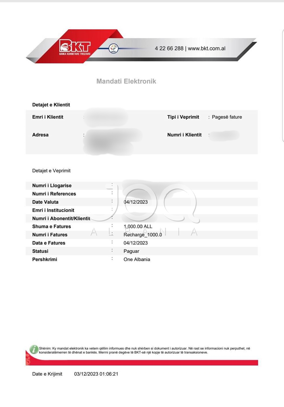 Pershendetje JOQ kam nji problem me one albanian , kam bere nje pages me ane te e-banking me kan marr leket edhe nuk me bejn oferten ,kontaktoj me agjentet edhe nuk me asistoj per asgje , jua kam nisur edhe bank statetment edhe perseri nuk me bejn oferten , nuk me vjen inat per leket se nuk jan shum po jan duke na vjedhur cdo dite , ju lutem raportojeni si problem ,. Faleminderit