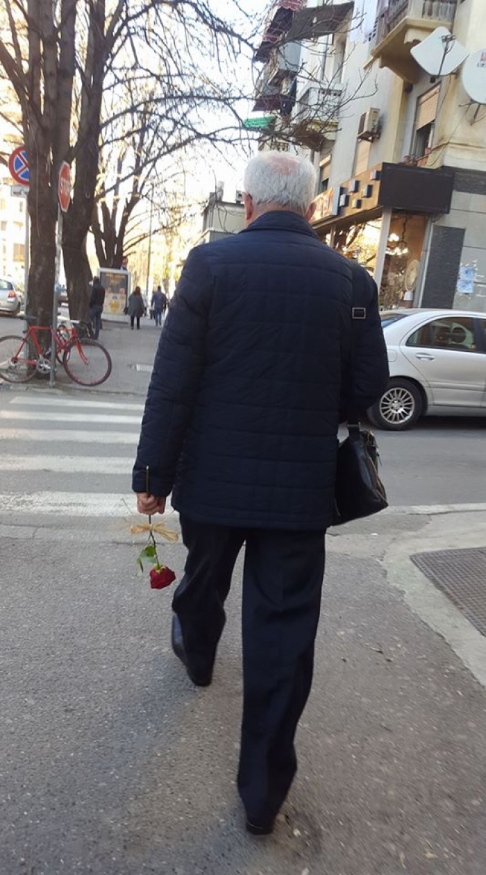 "Ndjehem i privilegjuar që gazetari Italian ka përzgjedhur mua ditën e "shën valentinit" duke bërë këtë foto me trëndafil të kuq në dorë, të cilin po ja çoja sime shoqje që më ka qëndruar besnike në ditët e vështira të jetës plot 35 vjet .