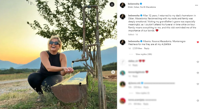 Në përshkrimin e postimit, Rexha shkroi: “Pas 12 vitesh, u ktheva në vendlindjen e babait tim në Dibër të Maqedonisë. Rilidhja me rrënjët dhe familjen time ishte thellësisht emocionuese.