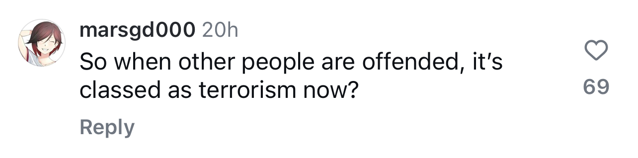 “Pra kur njerëzit ofendohen, tashmë qenka terrorizëm”,-komenton dikush tjetër me ironi.