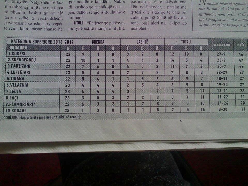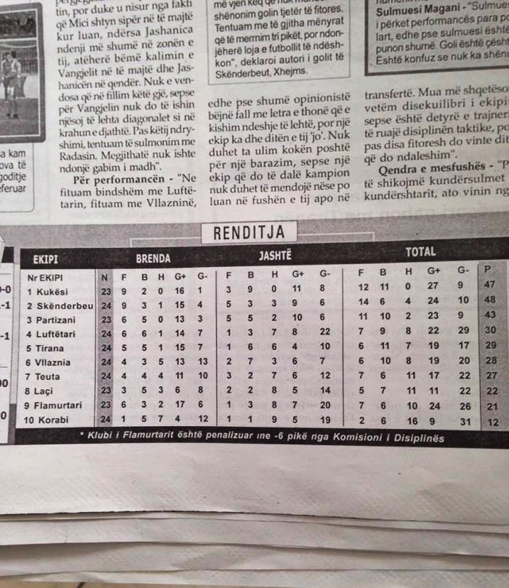 Nëse ekipi verior arrin të fitojë ndeshjen e sotme në Vlorë atëherë, gazetës në fjalë nuk i duhet ta ndryshojë fare tabelën e renditjes ditën e nesërme. Mos vallë gazetarët paguhen edhe për parashikime ndeshjesh? Apo mund të themi që janë “ngopur” me Skënderbeun kampion viteve të fundit?!
