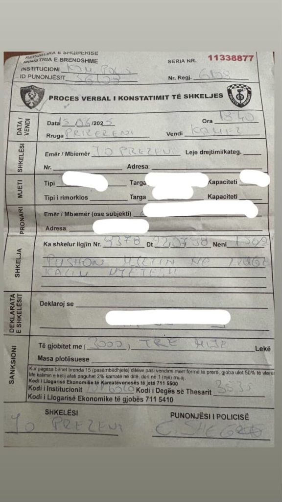 Një qytetar ka denoncuar absurditetin e sistemit të gjobave që për 3 javë nuk arrin të reflektohet në sistem, duke e lënë pezull mes pagesës dhe pritjes. Gjoba e vendosur më 15 qershor 2025 nuk është hedhur ende në platformën online, ndërkohë që në e-Albania figuron si gjobë ekzistuese, por e papagueshme. Kur qytetari përpiqet ta paguajë në mënyrë të rregullt, sistemi e refuzon, duke e detyruar të përballet me rrugët e Tiranës, harxhimet e naftës dhe radhët në polici, për një shumë më të vogël sesa shpenzimet që i duhen për ta kryer procesin.