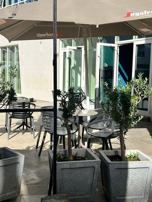 Tek kompleksii ish klubi partizani. Magnet Sports Bar i Olger Xhepes e ka mbyllur oborrin e pallatit me vazo betoni, perpos karrigeve dhe cadrave. Banoret kalojnë tek ai cepi i vogël 1/2 e oborrit te pallatit eshte e bllokuar
