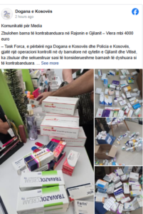 “Dyshohet se këto produkte janë futur në mënyrë të paligjshme në territorin e Kosovës, duke anashkaluar procedurat e importit dhe detyrimet doganore. Sipas vlerësimeve fillestare, vlera e barnave të sekuestruara kap shumën mbi 4000 euro”, thuhet në njoftim.