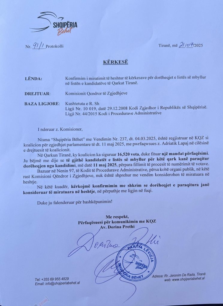 Lapaj thotë se përderisa KQZ nuk ka marrë vendim, dorëheqjet konsiderohen të miratuara në heshtje dhe kërkon konfirmimin me shkrim. shkresa e Lapajt mban datën e sotme, 21 korrik dhe i drejtohet kreut të KQZ, Ilirjan Celibashi. Kjo nuk është shkresa e parë e Lapajt drejtuar KQZ pasi ai e kishte nisur edhe më 17 korrik një shkresë ndaj KQZ-së, ku kërkonte të mos merreshin parasysh kërkesat e të dorëhequrve.