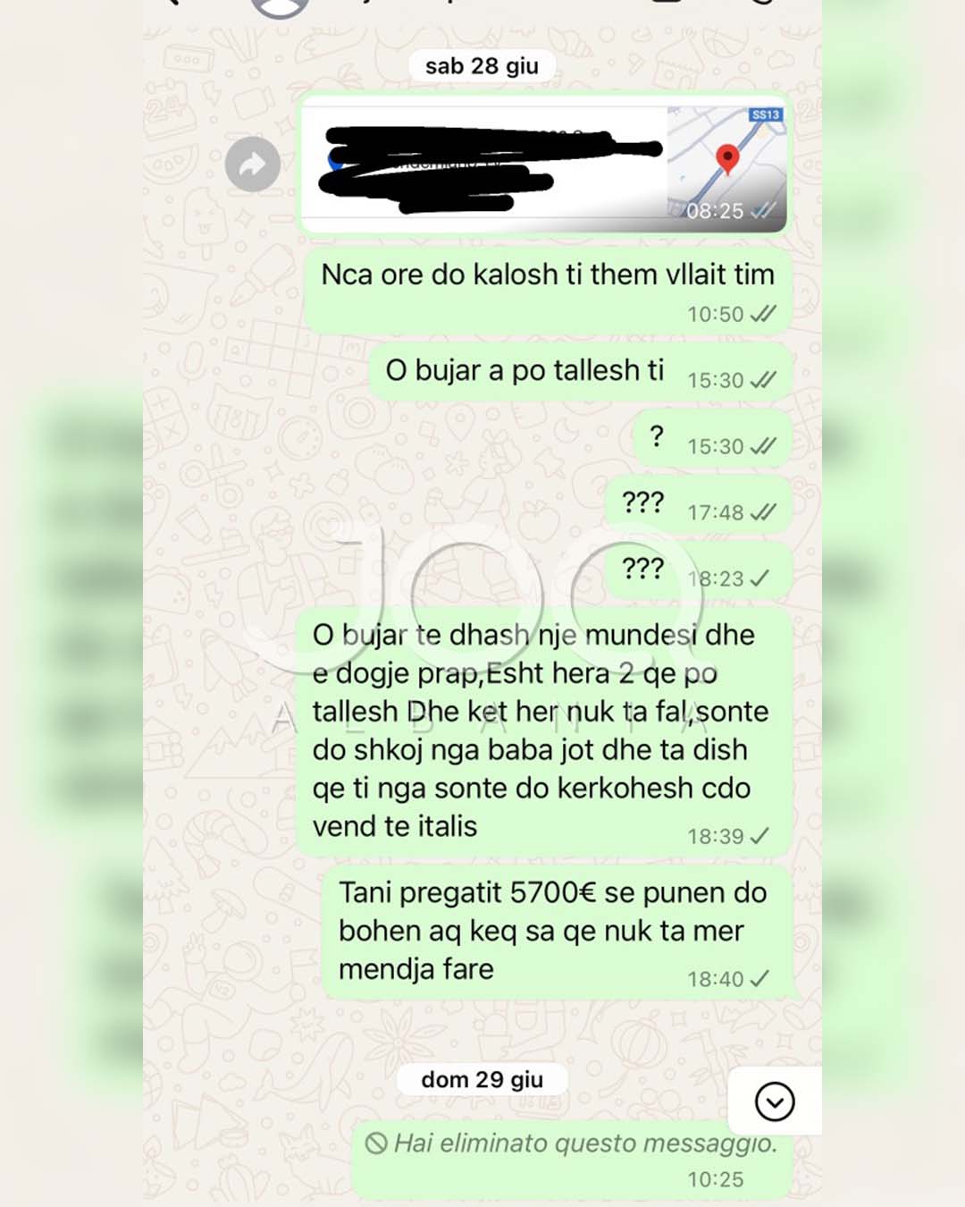 Ai më ka bllokuar mua dhe të gjithë ne që na ka marrë lekët. U zhduk fillimisht për një javë, pastaj kur kapa njerëzit e shtëpisë më doli vetë dhe më mashtroi sërish, duke më thënë që do të më kthente të paktën gjysmën, por “gjoja” bankomati i kishte vënë limit. Pas kësaj bisede që ju kam dërguar, u zhduk fare dhe na ka bllokuar gjithandej.
