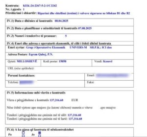 KEK’u ka shpallur fitues në tenderin për riparim dhe testim të valvave siguruese në bllokun B1 dhe B2 konserciumin UNIVERS-M SH.P.K dhe ICI doo, kompani me seli në Beograd të Serbisë.
