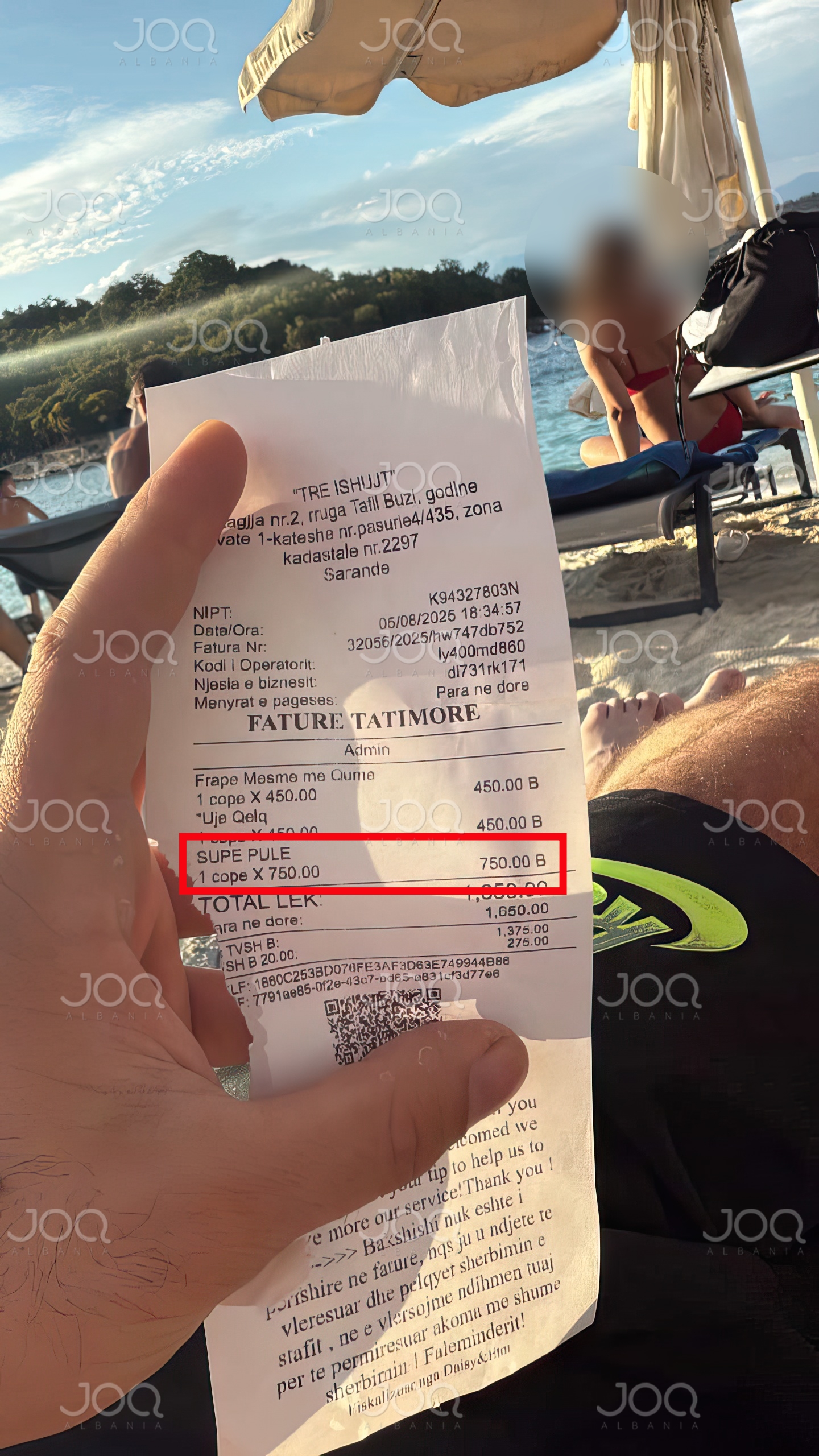 "Pershendetje JOQ, 3 Ishujt në Ksamil, një supë 750 lekë të reja pa pikë pule."