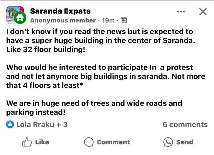 "Nuk e di nëse keni lexuar lajmet, por pritet të ndërtohet një ndërtesë shumë e madhe në qendër të Sarandës. Një ndërtese me 32 kate! Kush do të ishte i interesuar të marrë pjesë në një protestë dhe të mos lejojë më ndërtimin e ndërtesave të mëdha në Sarandë? Të paktën deri në 4 kate! Ne kemi nevojë urgjente për pemë, rrugë të gjera dhe parkingje në vend!," -shprehen të huajt në postim.
