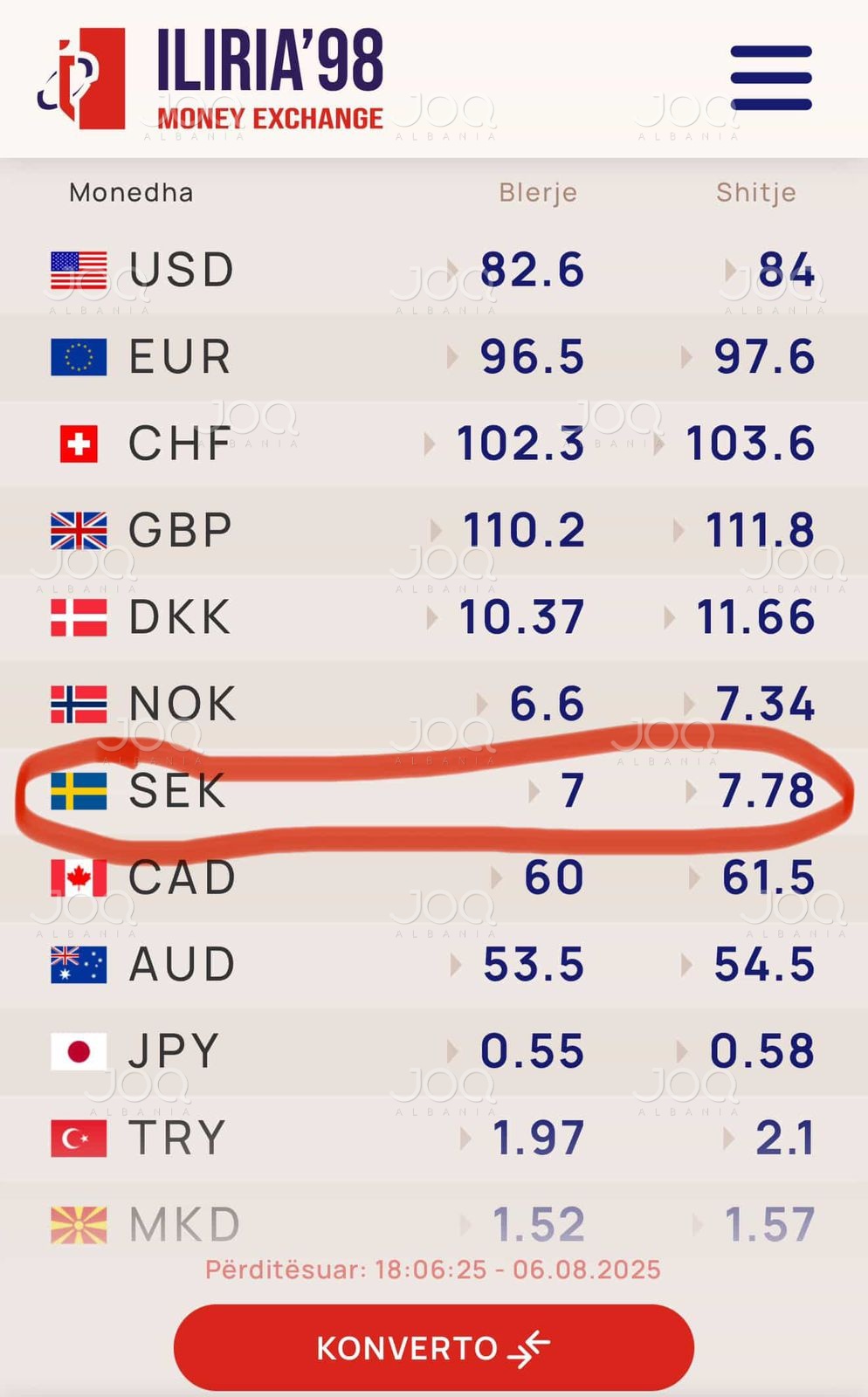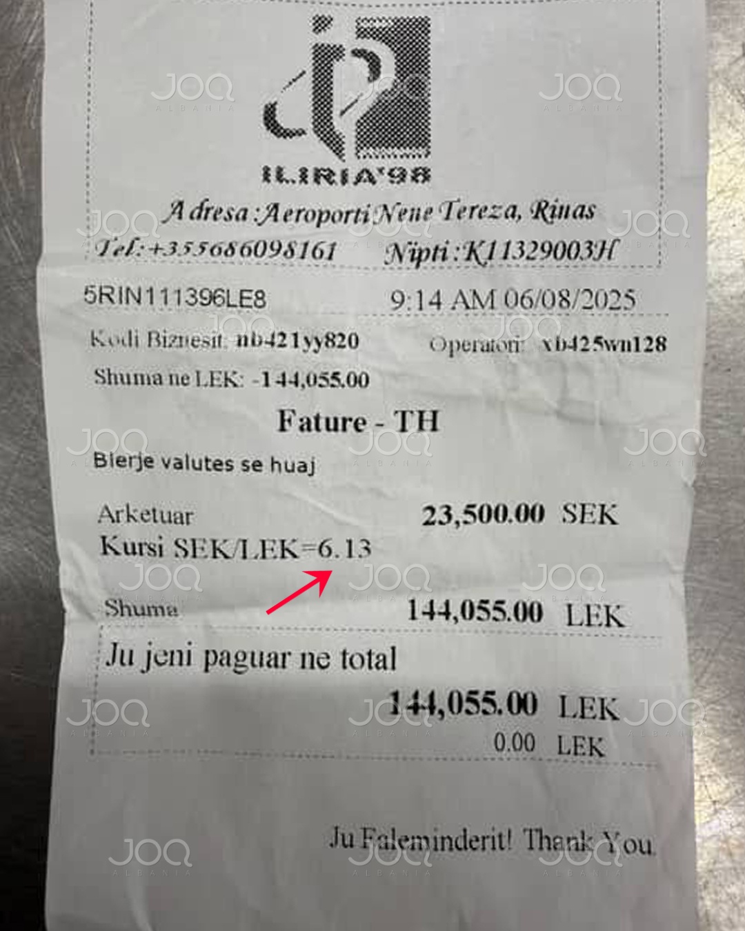 “Prsh JOQ! Nje miku im sot me date 07/08/2025, ne mengje rreth ores 09:14, ka ardhur nga Suedia. Kur ka zbrit ne Rinas i eshte dashur te shkembej 23 500 Kruna Suedeze ne valuten ton (leke) tek lliria98 ne Rinas. Ne aplikacionin online lliria98 kishte kursin me 7, dmth 23 500 x 7 = 164 500 lek. Nderkohe zyra e lliria98 ne Rinas ja kan logaritur me 23 500 x 6.13 = 144 055. Nje diferenc shume e madhe prej 20 445 lek qe i janë mbajtur."