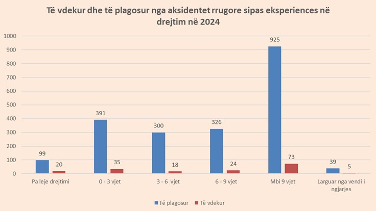 Statistikat e aksidenteve për vitin 2024 tregojnë një panoramë alarmante. 2085 persona janë plagosur dhe 175 kanë humbur jetën. Të dhënat sipas përvojës së drejtuesve të mjeteve tregojnë se numrin më të madh të të plagosurve e mbajnë shoferët me mbi 9 vite eksperiencë plot 925 raste, ndërsa 73 prej tyre nuk kanë mundur t’i mbijetojnë përplasjes. Kjo tregon se përvoja e gjatë nuk garanton siguri në rrugët shqiptare.