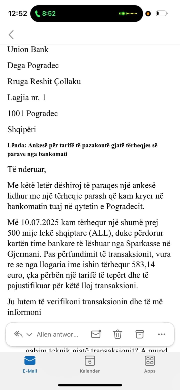 Një qytetare ka denoncuar një rast të mbajtjes së komisioneve të fryra në bankat shqiptare konkretisht tek Union Bank në Pogradec, ku rrëfen se iu mbajt një shumë e tepruar si komision gjatë tërheqjes së parave nga bankomati.