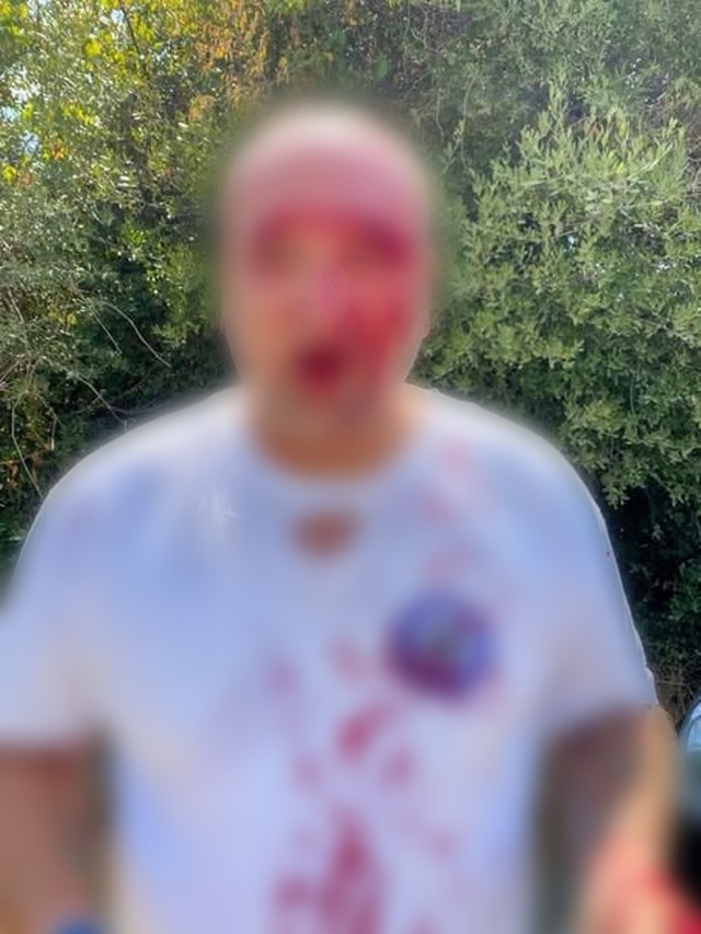 Albi erdhi nga përpara, punonjësit e tij, një nga e djathta, një nga e majta. Të tre filluan të më godisnin në kokë dhe fytyrë me grushte. Njëri prej tyre më përdredhi krahun që të mos mund të mbrohesha. Më rrëzuan përtokë dhe filluan të më shkelmonin në kokë, gjoks, stomak, brinjë. Më grisën edhe vathët që kisha në veshë. Më grabitën gjithashtu telefonin, me vlerë disa qindra euro, dhe e thyen. Me shumë gjasa më vodhën edhe kapelen, e cila kishte vlerë sentimentale për mua, si pjesë e një trofeu.