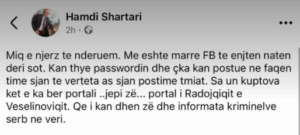 Pas një vale kritikash, Shartari e ka fshirë postimin dhe ka reaguar, duke pretenduar se nuk ka qenë ai autori i statusit, por se dikush ia kishte thyer fjalëkalimin.