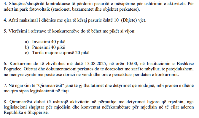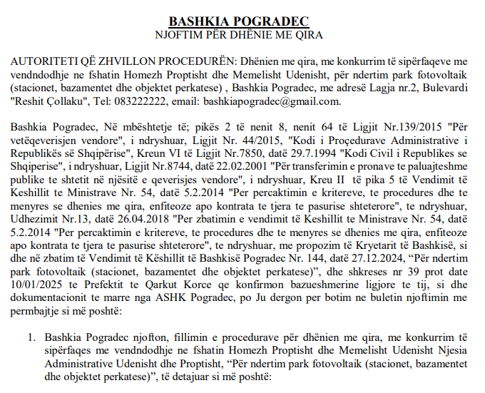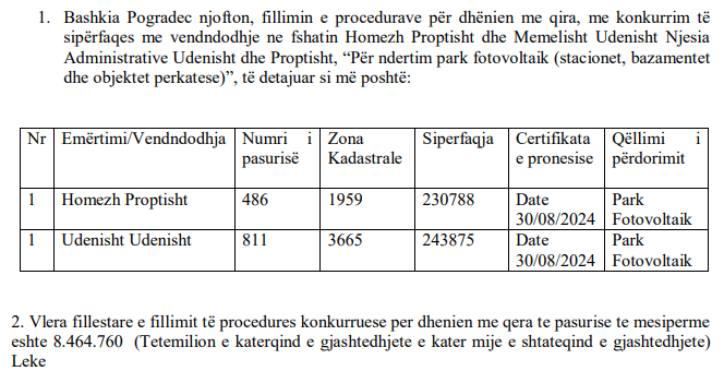 Më 11 gusht, Bashkia Pogradec ka nisur procedurat për dhënien me qira të tokave rurale në fshatrat Homezh, Proptisht dhe Memelisht, në Njësitë Administrative Udenisht dhe Proptisht. Objekti i tenderit është ndërtimi i një parku fotovoltaik, që përfshin stacionet, bazamentet dhe objektet përkatëse.