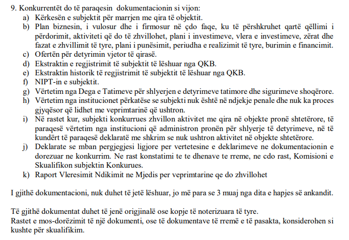 Vlera dysheme e tenderit është 8,464,760 lekë, ndërsa kontrata parashikon dhënien me qira për një periudhë 10-vjeçare.