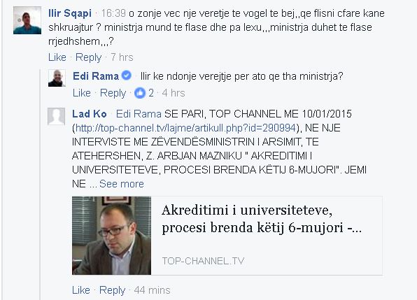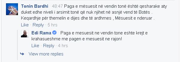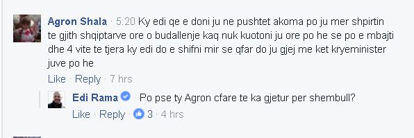 "Ky Edi që e doni ju në pushtet akoma po ju merr shpirtin të gjithë shqiptarëve ore budallenj, kaq nuk kuptoni ju ore po he se po e mbajti dhe 4 vite të tjera ky Edi do e shifni mirë se çfarë do ju gjejë me këtë kryeministër juve po hë", ka qenë ky komenti i një qytetari të revoltuar me qeverisjen e Ramës, ndërsa ky i fundit i është përgjigjur: