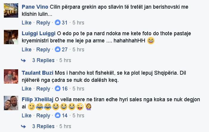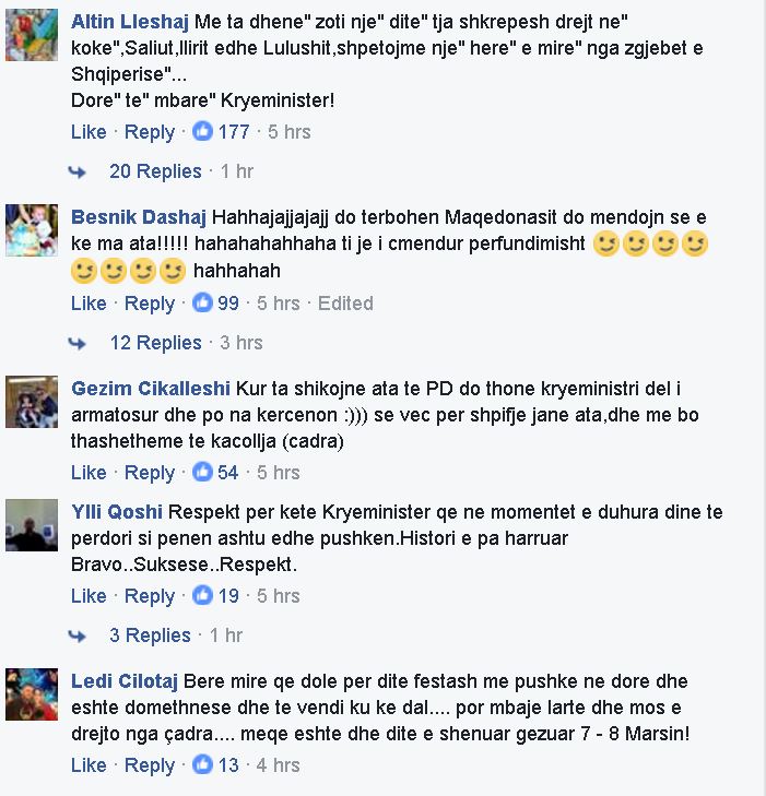 Gjithashtu kryeministri ka postuar një foto me një armë në dorë, gjë që ka shkaktuar shumë reagime, ndërsa një nga komentuesit thotë: "hahahaha ti je i çmendur përfundimisht".