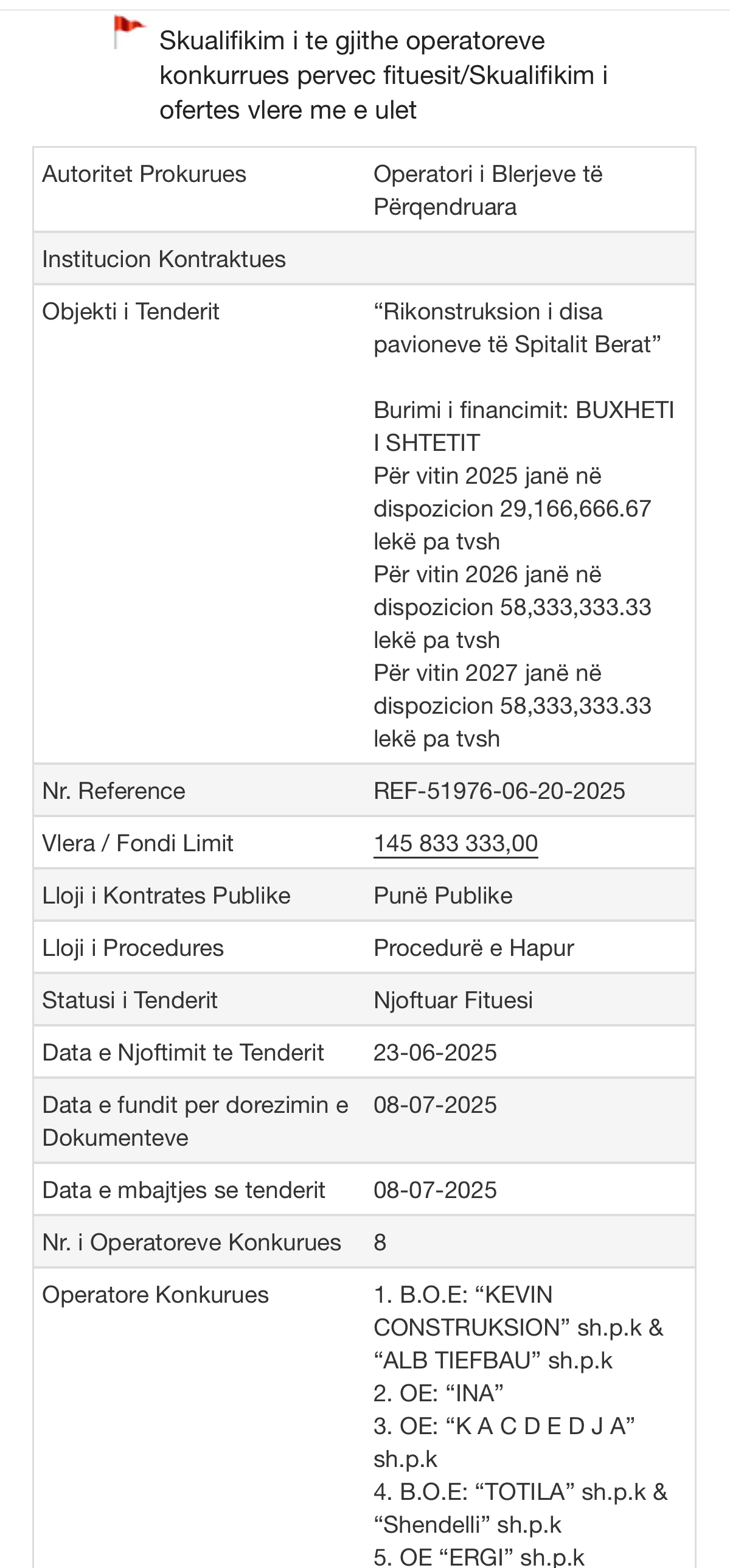 Ky është një tjetër rast që ngre pikëpyetje mbi mënyrën si zhvillohen tenderët publikë dhe kriteret e përzgjedhjes së fituesve, sidomos kur bëhet fjalë për subjekte të lidhura me persona që po vuajnë dënime në burg.