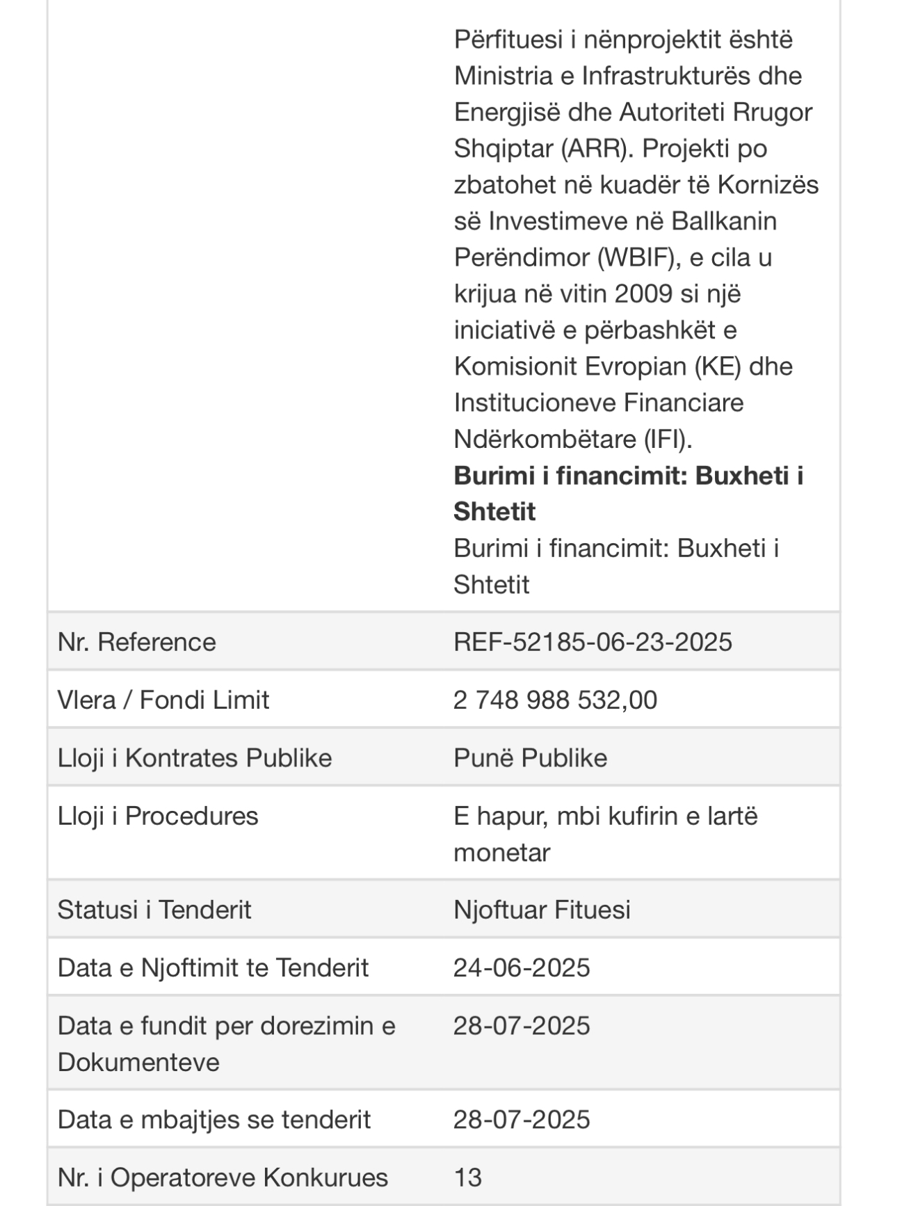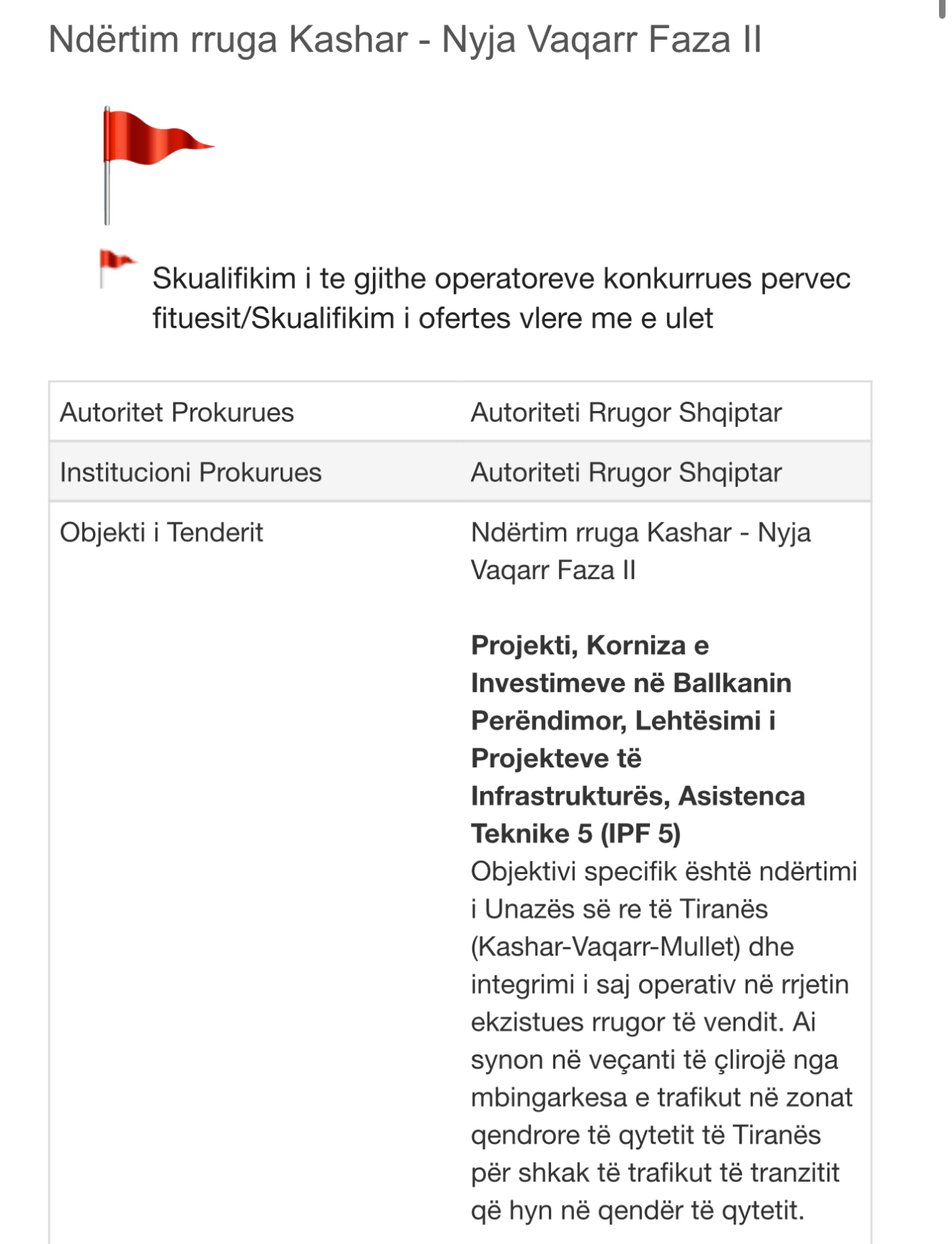 Një tender me fond limit 27 MILIARD Lekë për Rrugën Kashar–Vaqarr Faza II ka shpallur së fundmi fitues një bashkim kompanish të dyshimta.