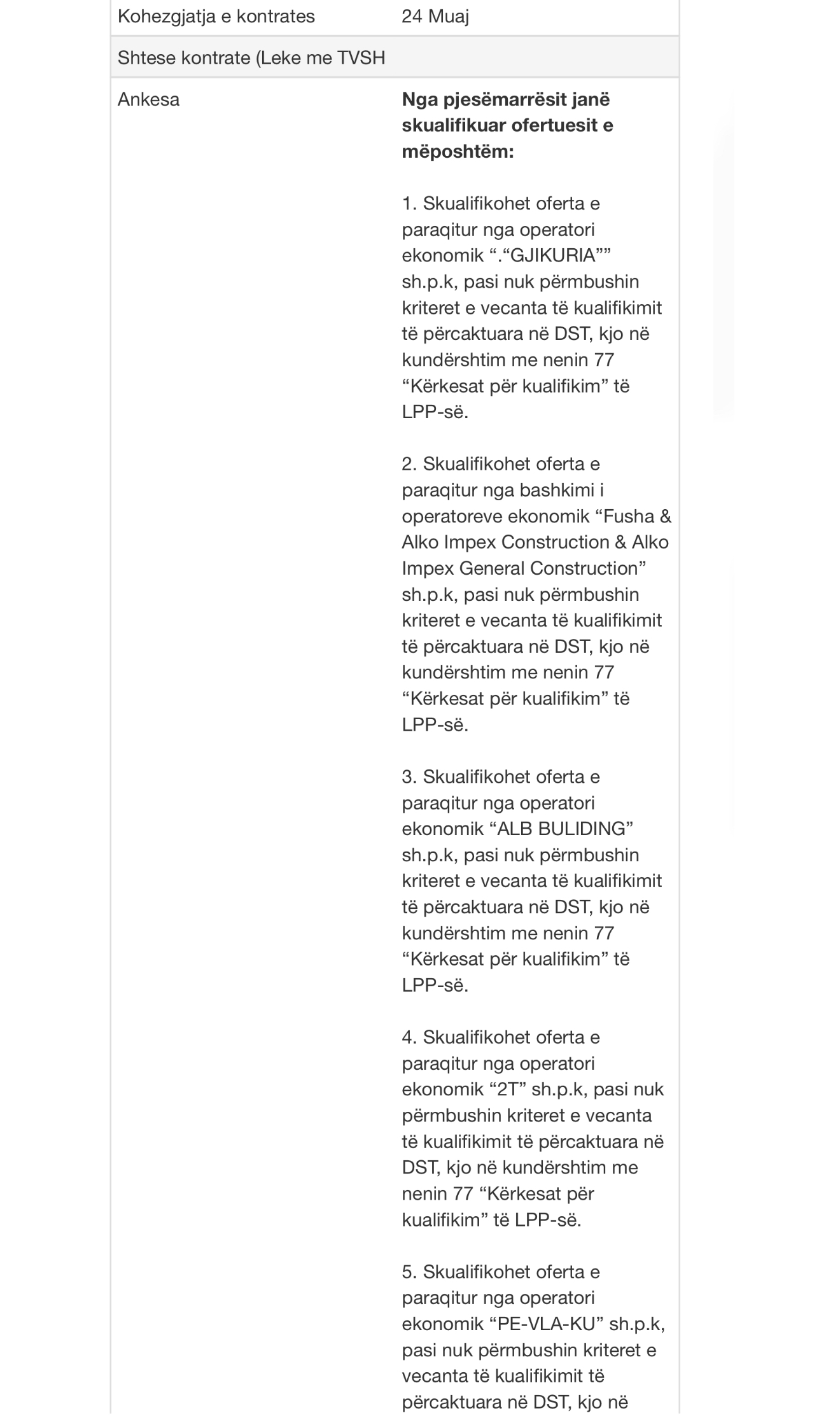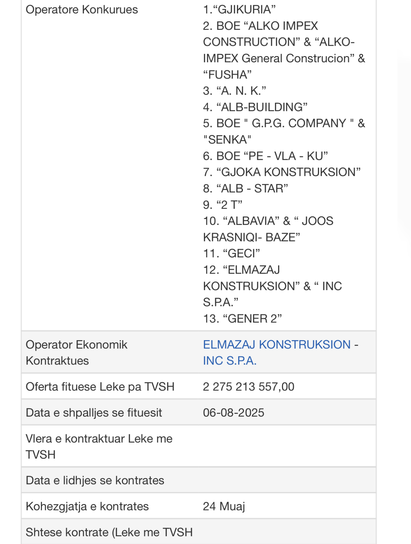 Tenderi ka ngjallur diskutime, pasi nga 13 operatorë konkurrues janë skualifikuar të gjithë, bashkë me atë aë ka dhënë ofertën ekonomike më të ulët.