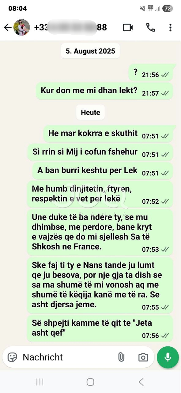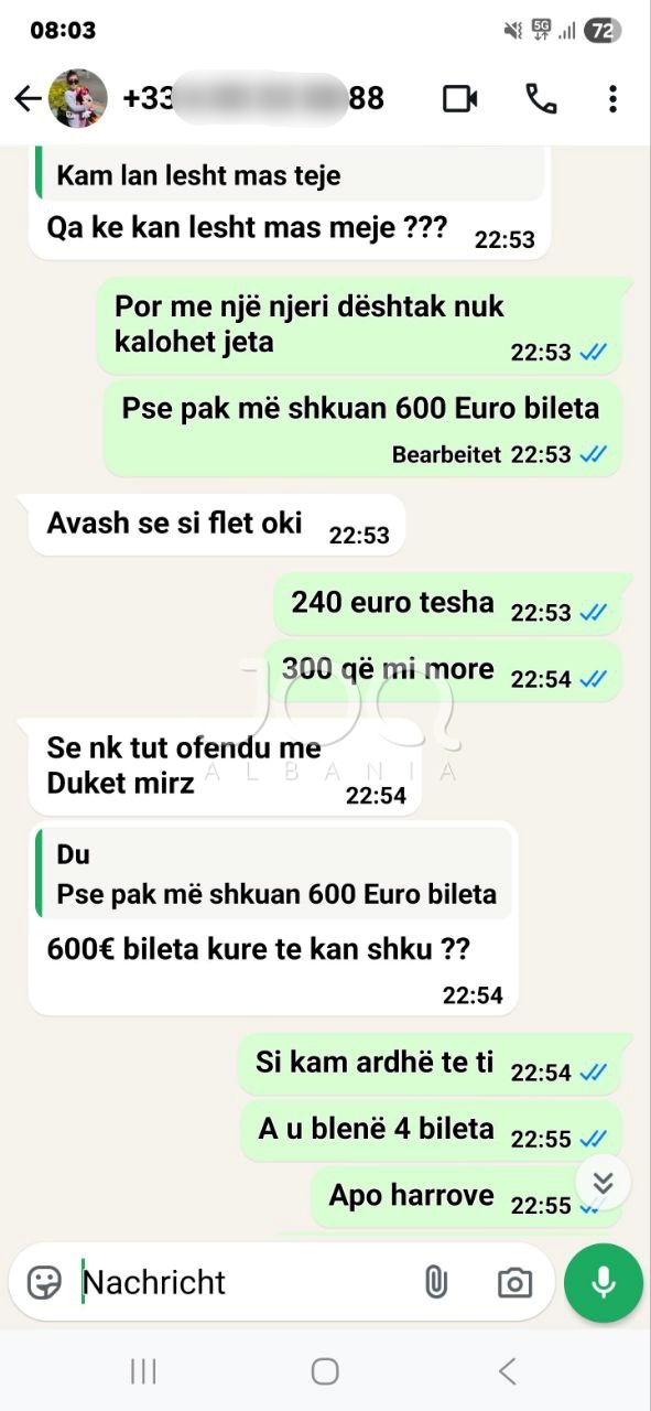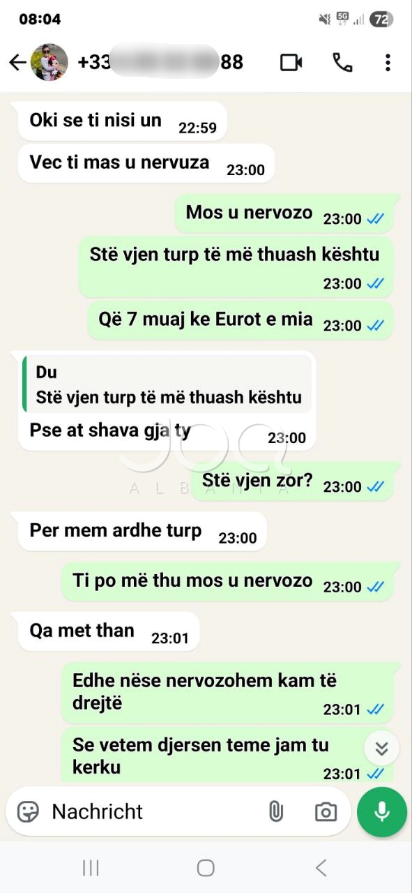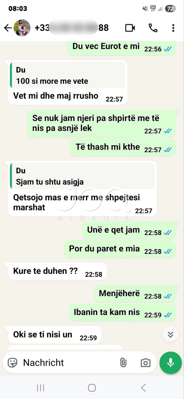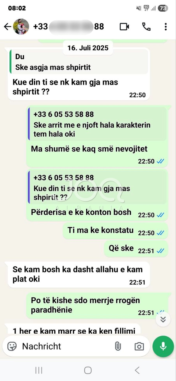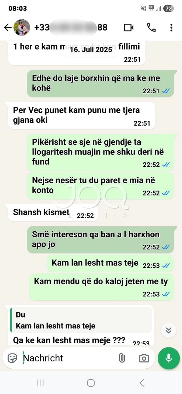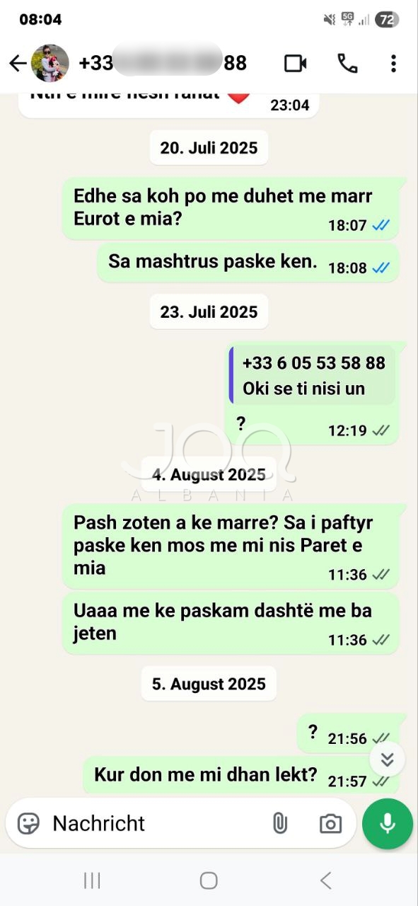 "Përshëndetje JOQ, kam njohur një zotëri nëpërmjet nënës së tij, Meliha Shkreli. Ajo ma këshilloi djalin e saj për njohje serioze. I besova dhe mendova që nuk do të kisha zhgënjim. Kur pashë që muajt kaluan dhe ai nuk po ndryshon, edhe eurot e mia nuk po mi kthen, atëherë u tërhoqa. Ai quhet Gazmend Zuesi, 37 vjeç, nga Shkodra, i divorcuar me një vajzë 6-vjeçare dhe jeton në Francë. Unë jetoj në Gjermani. Më pas i luta disa herë këtij dhe nënës së tij për borxhin që më kishte. Nënës së tij i tha: “Ju jeni marrë vesht, unë vetëm ju kam prezantuar.” Kurse ai më rren duke thënë që do t’ia jap, por deri më 10.02.2025 nuk mi ka kthyer eurot e mia. Janë 600 euro që më ka. Duke parë që ju jeni një faqe shumë e njohur, mendova ta ndaj këtë problem që ju ta publikoni në internet".