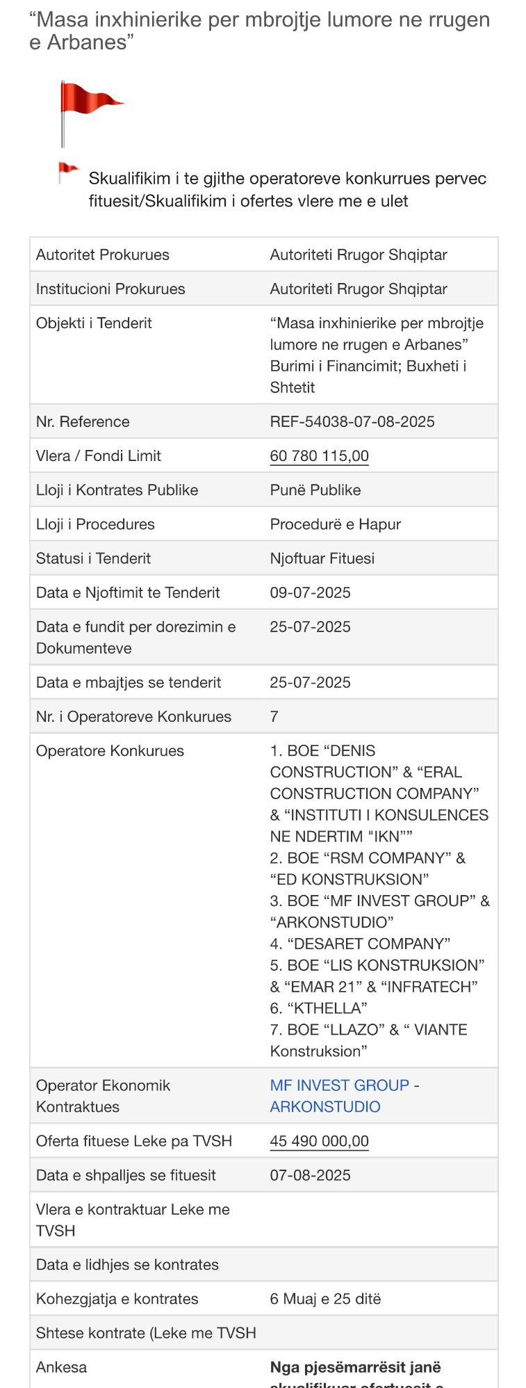 Tender është shënuar me "Flamur të Kuq" për Skualifikim të të gjithë operatorëve në garë dhe skualifikim të ofertës më të ulët ekonomike.