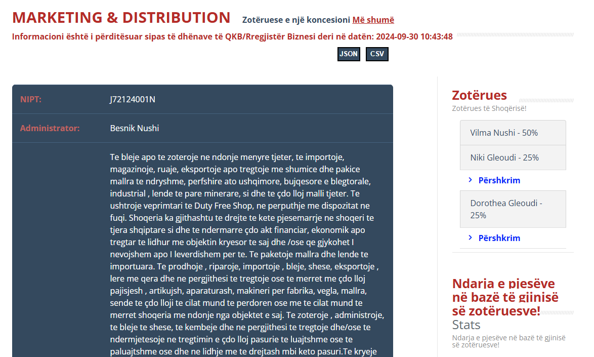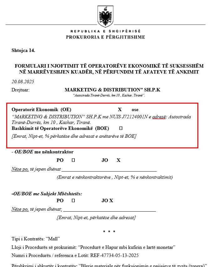 Prokuroria e Përgjithshme, institucioni që duhet të garantojë ligjshmërinë dhe mbrojtjen e parave publike, vetë akuzohet për abuzim të hapur me një tender. Objekti i kontratës ka qenë “Blerje materiale për funksionimin e pajisjeve të zyrës (tonera)” për Prokurorinë e Përgjithshme dhe institucionet në varësi. Tenderi është zhvilluar nga Zyra e Prokurorit të Përgjithshëm, ndërsa fituese është shpallur kompania Marketing & Distribution, në pronësi të Vilma Nushit, Niki Gleoudi dhe Dorothea Gleoudi.